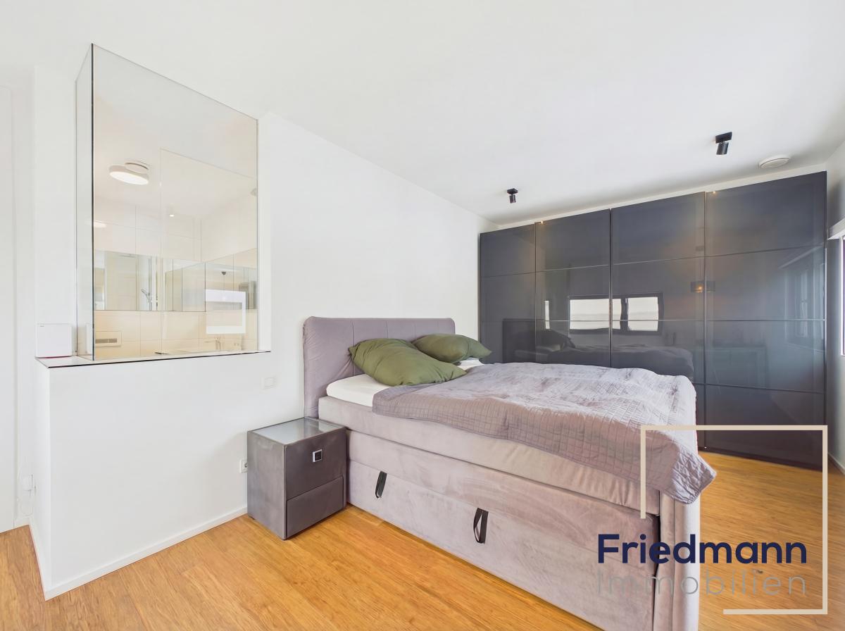 Die Wohnung verfügt über ein gut geschnittenes Schlafzimmer mit ausreichend Platz für Stauraum. Das Badezimmer ist als modernes Duschbad ohne Badewanne gestaltet und verfügt über eine Eckverglasung zum Schlafzimmer, wodurch auch hier Tageslicht vorhanden ist.