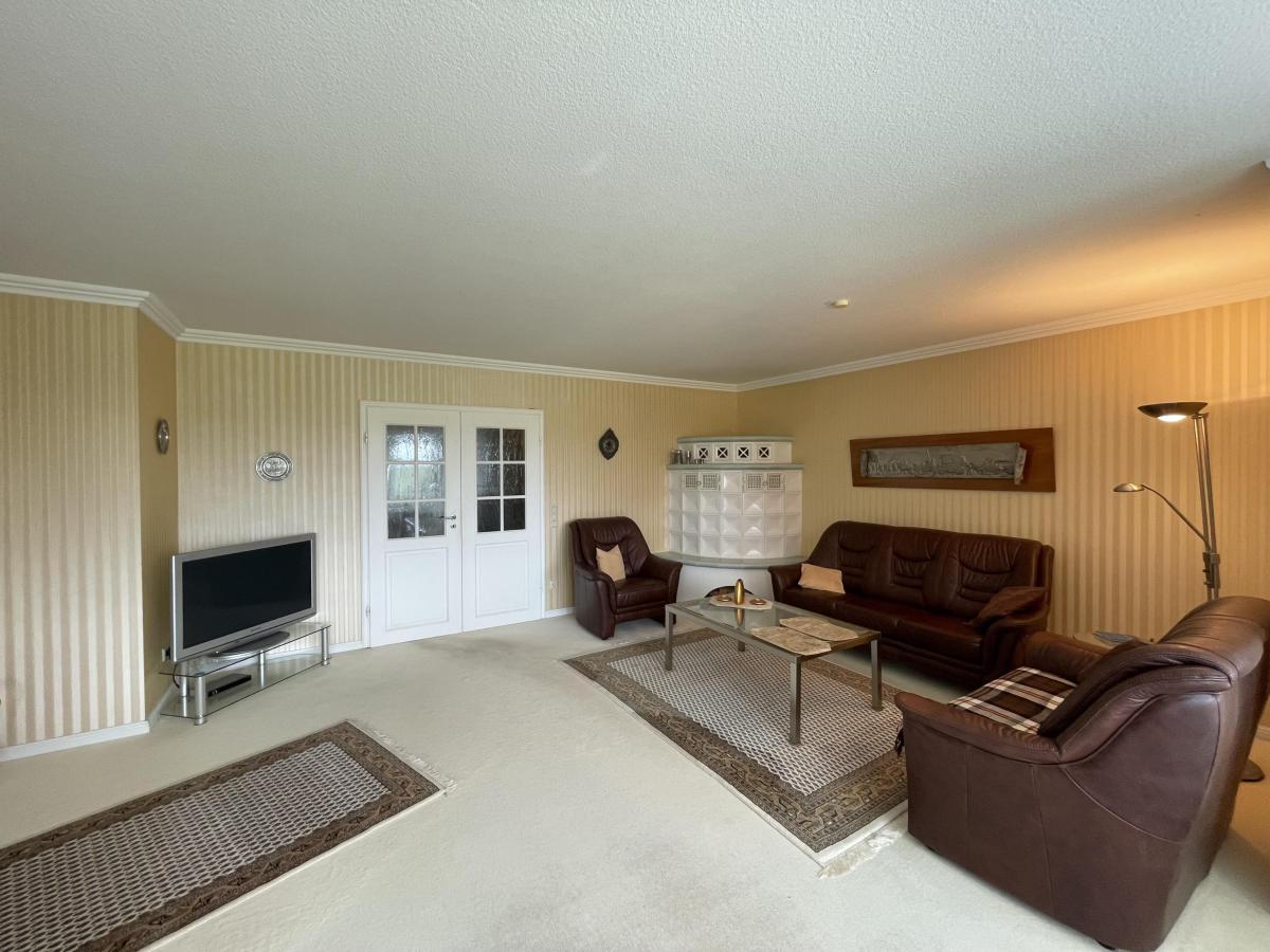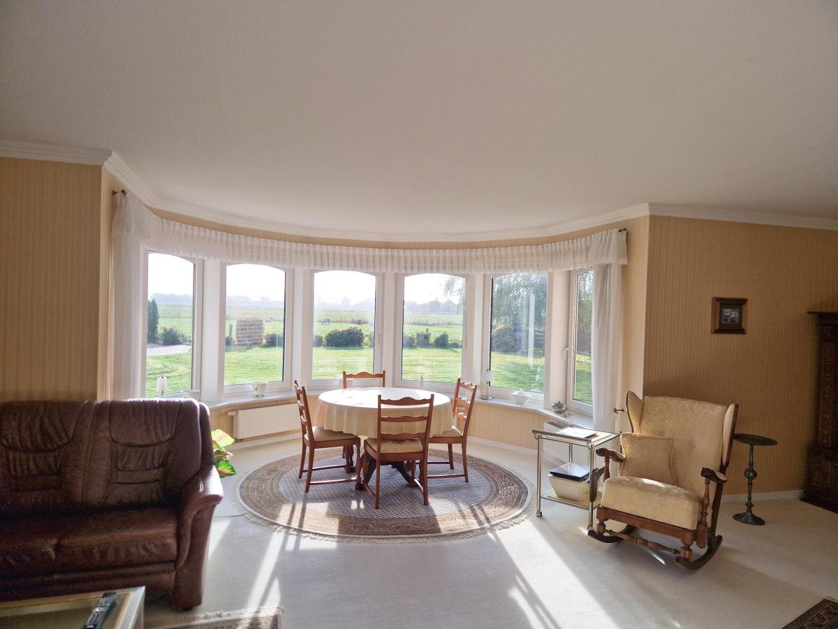 Das Herzstück der Ebene ist unverkennbar das Wohnzimmer mit dem eindrucksvollen und lichtdurchfluteten Erker. Von hier können Sie den gepflegten Garten und vor allem die angrenzenden Felder sehen. Auf diesen lassen sich gelegentlich auch grasende Schafe in der Ferne beobachten. Idylle pur ~ Ruhesuchende und Landschaftsliebhaber werden das zu schätzen wissen.