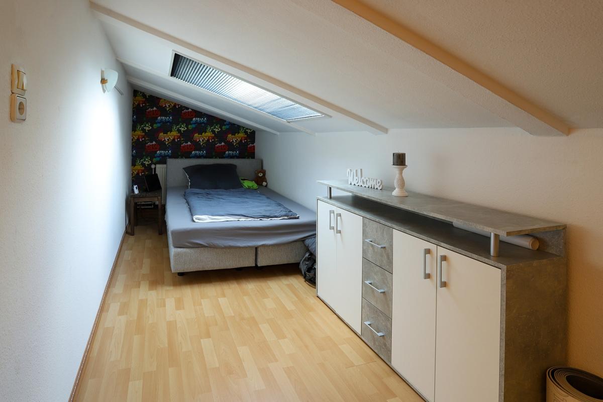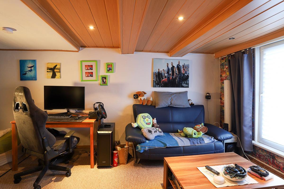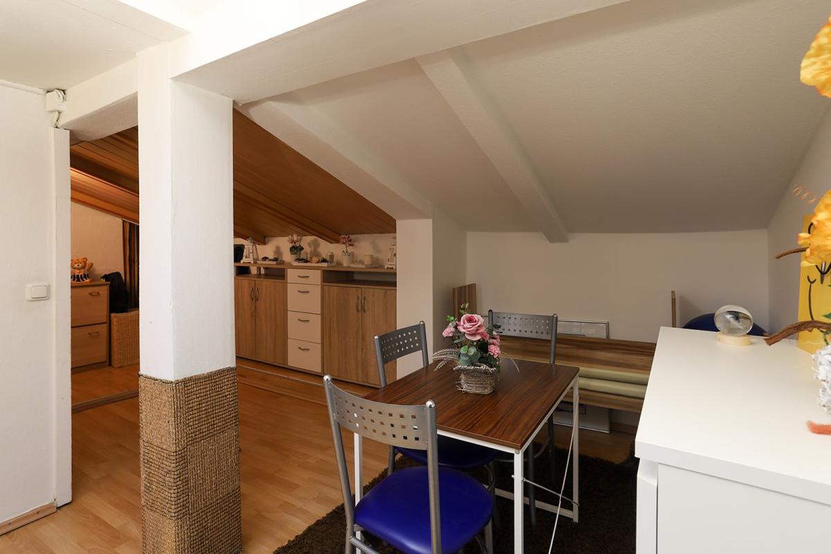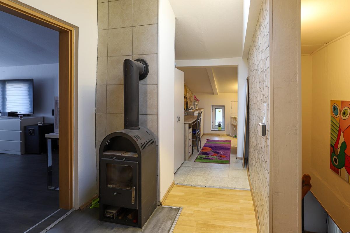 Zurück ins Haus, denn wir haben noch das Dachgeschoss zu betrachten. Dies könnte das zukünftige Reich der Kinder werden oder aber ein Büro - mit allem was man so braucht. Vor langer Zeit wurde dieser Bereich als Einliegerwohnung innerhalb der Familie genutzt. Derzeit befindet sich hier das Kinderreich. Ein helles Wohnzimmer mit angrenzenden Schlafzimmer und Badezimmer mit Badewanne befinden sich im vorderen Bereich. Die kleine Küche wurde entfernt, so dass wir hier jetzt einen weiteren Arbeitsbereich mit Sitzmöglichkeit und Kaminofen befindet. Ein weiteres großes Kinderzimmer rundet den oberen Bereich ab.