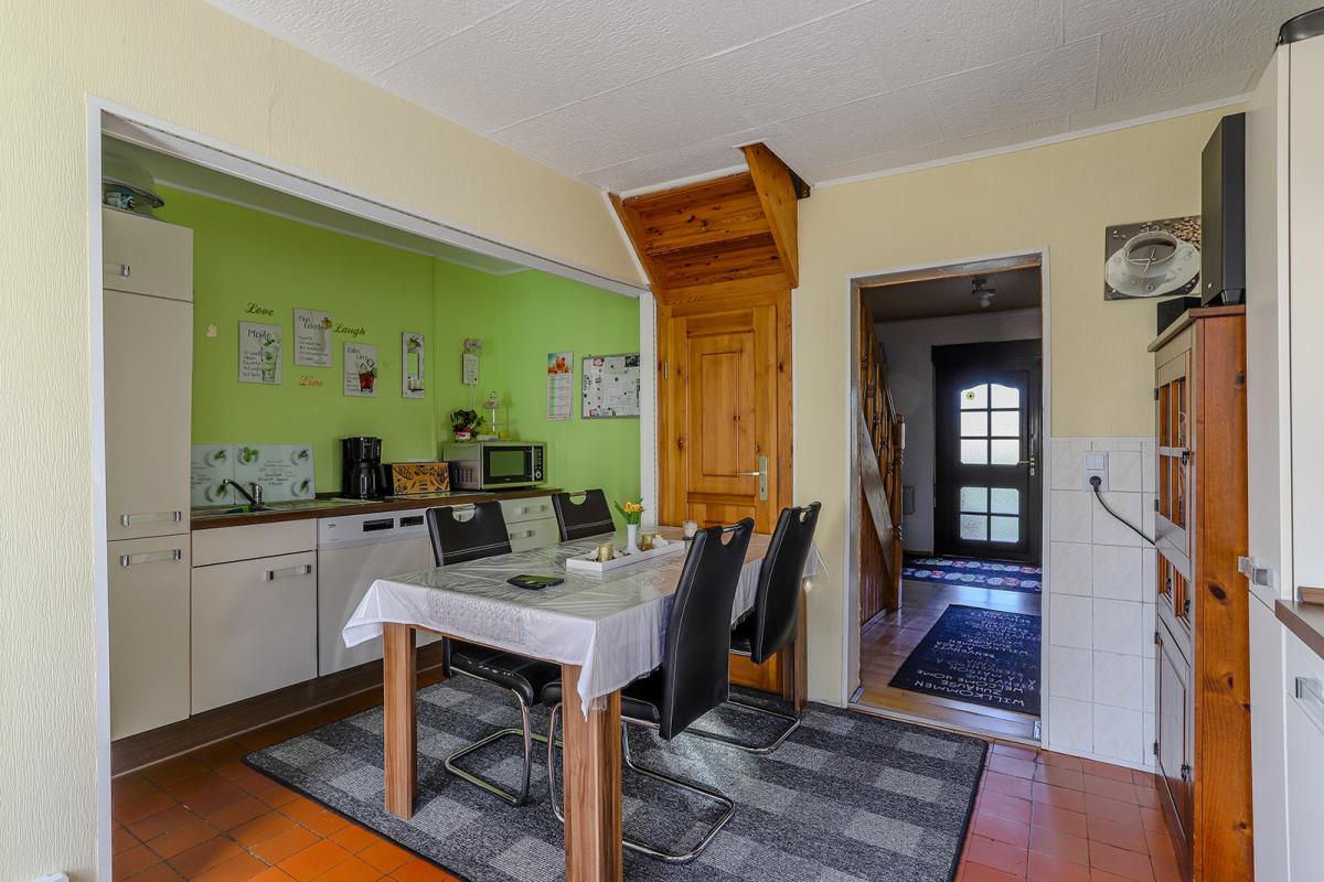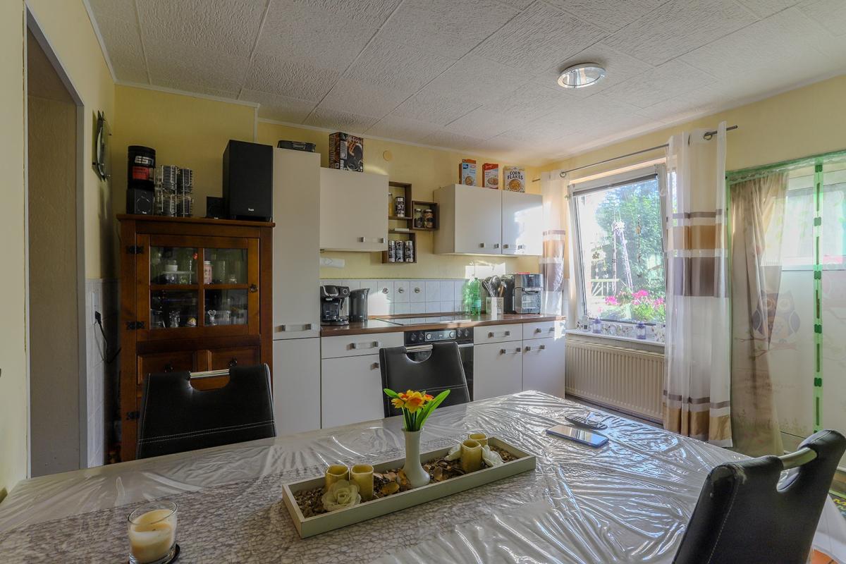 Nun gelangen wir in die Küche. Diese ist praktisch gestaltet und bietet Platz für ein schnelles oder ausgedehntes Frühstück. Von hier aus gelangt man in den kleinen Keller, zum Bad mit separater Dusche, in den geräumigen HWR und natürlich in den tollen Garten.
