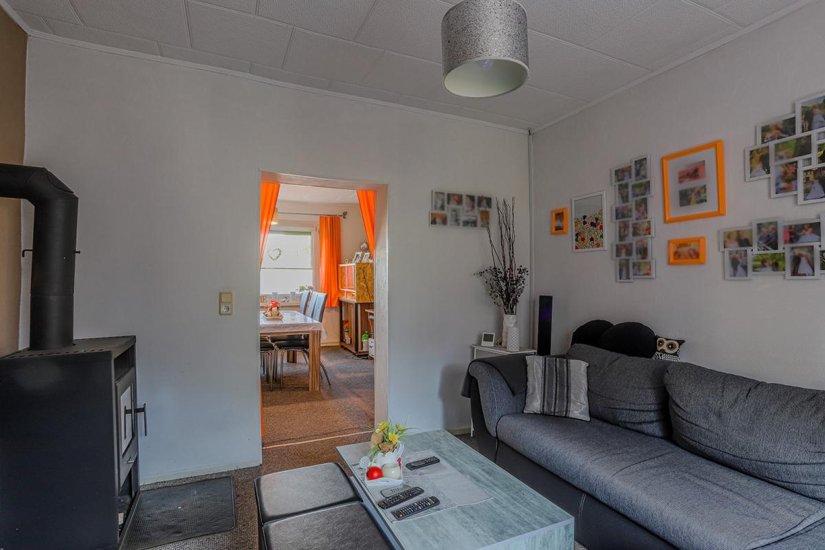 Aber beginnen wir im Inneren des Hauses. Begrüßt werden wir im hellen Eingangsbereich. Von diesem aus gelangen wir ins geräumige Esszimmer, welches direkt im Wohnzimmer mündet. Hier befindet sich der erste Kaminofen und lädt an kalten, regnerischen Tagen zum gemütlichen Beisammensein ein.