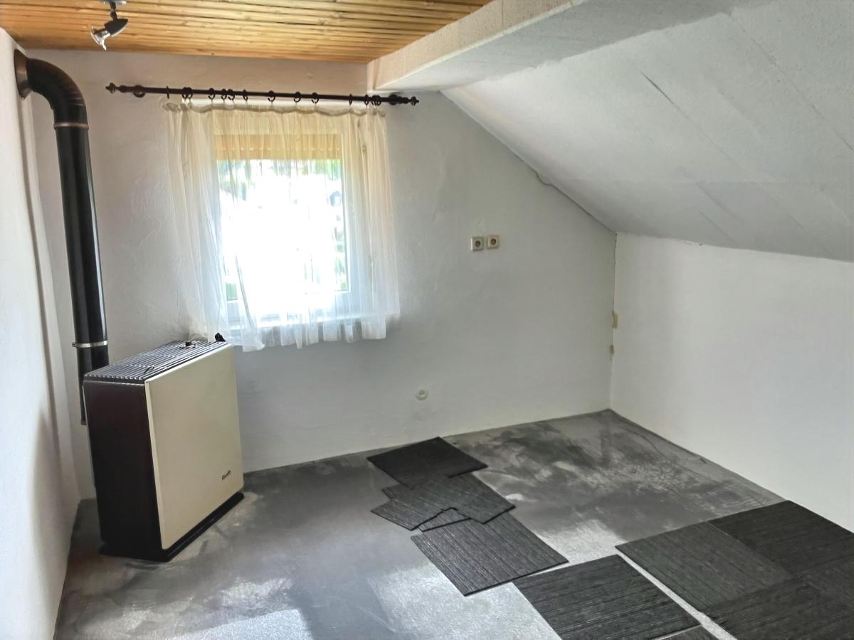 Die zweite Wohneinheit erstreckt sich über das Ober- und Dachgeschoss und bietet viel Platz für eine Familie. Im Obergeschoss befinden sich ein Schlafzimmer, ein weiteres Zimmer, ein Durchgangszimmer mit Zugang zum Balkon, ein Badezimmer sowie eine separate Dusche.