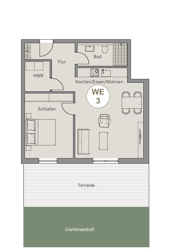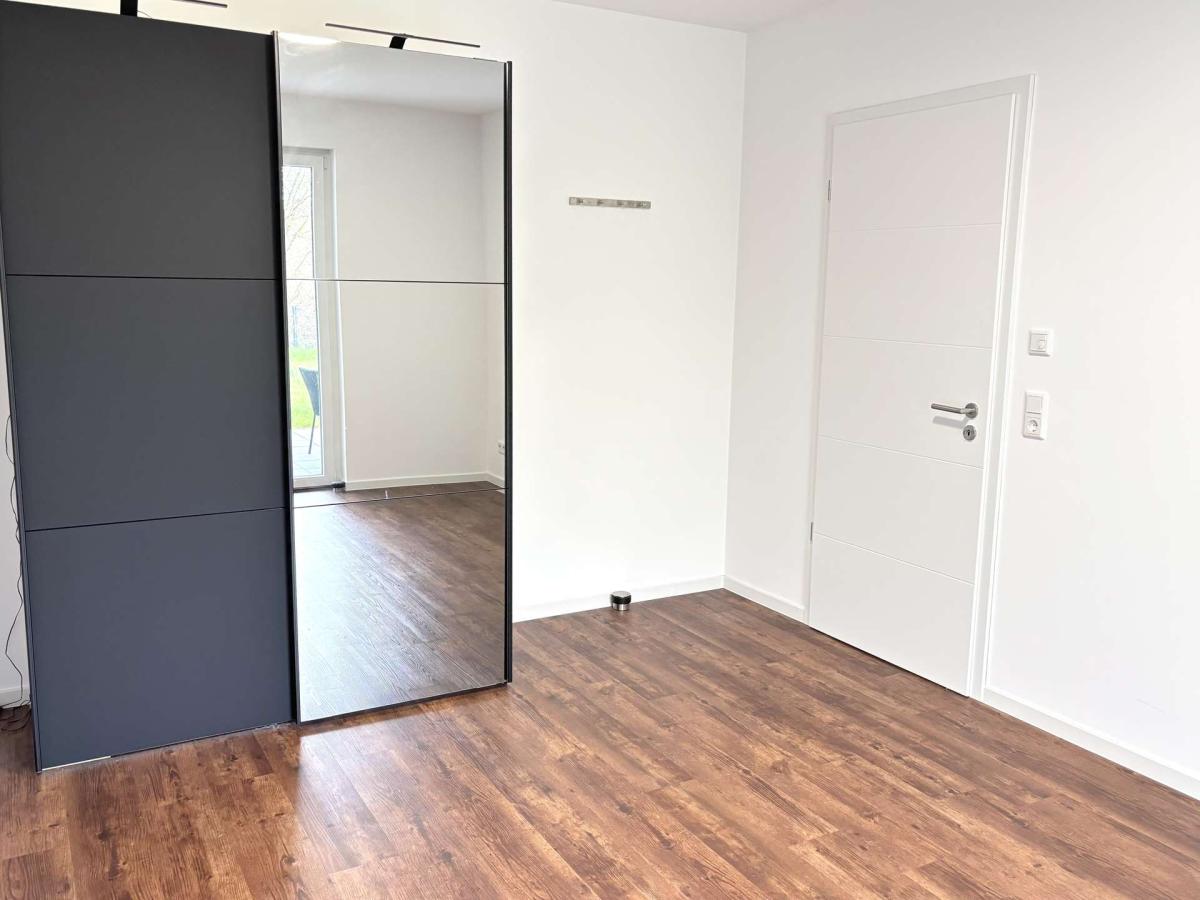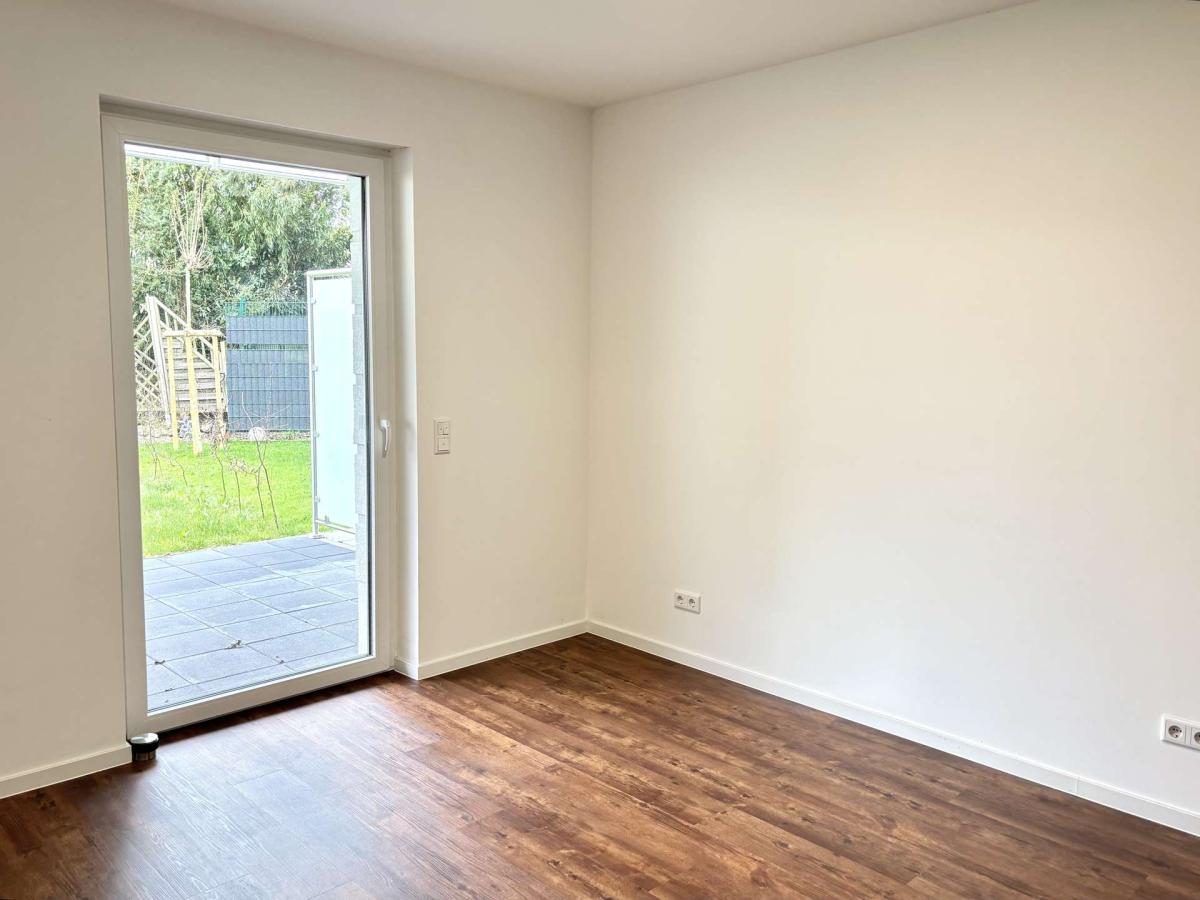 Das Schlafzimmer bietet einen ruhigen Rückzugsort und ermöglicht – ebenso wie der Wohnbereich – direkten Zugang zur Terrasse und dem eigenen Gartenanteil.