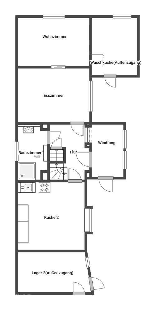 Die Küche im Erdgeschoss ist separat gehalten und funktional geschnitten. Hier ist Raum für eine klassische Küchenzeile und zusätzliche Schränke. Ein Badezimmer im Erdgeschoss ergänzt die Ebene praktisch, etwa für den schnellen Start in den Tag oder für Gäste.