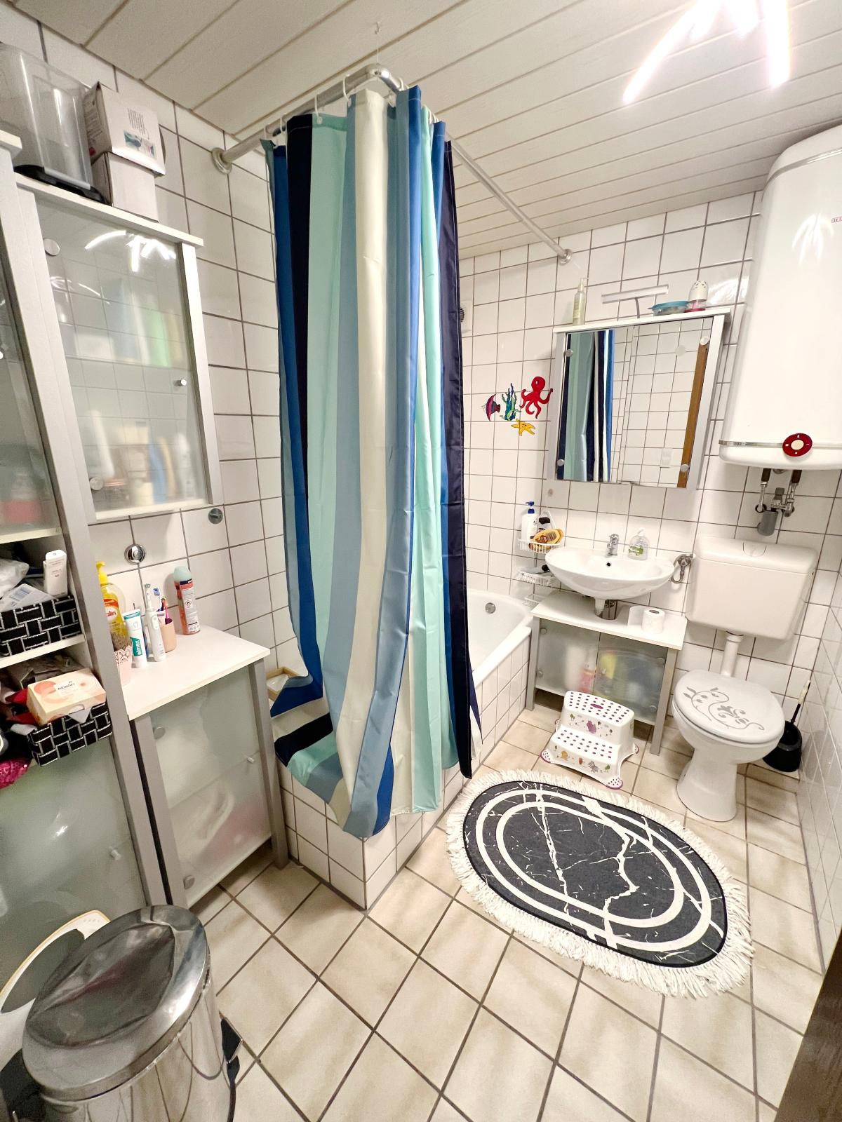 Über das offene Treppenhaus erreichen Sie das 1. Oberschoss. Hier befinden sich 2 Schlafzimmer und ein Badezimmer. Das Bad verfügt über eine Badewanne, ein Waschbecken und ein WC. Von einem Zimmer erreichen Sie den Balkon. Das erste OG ist ebenfalls gefliest.