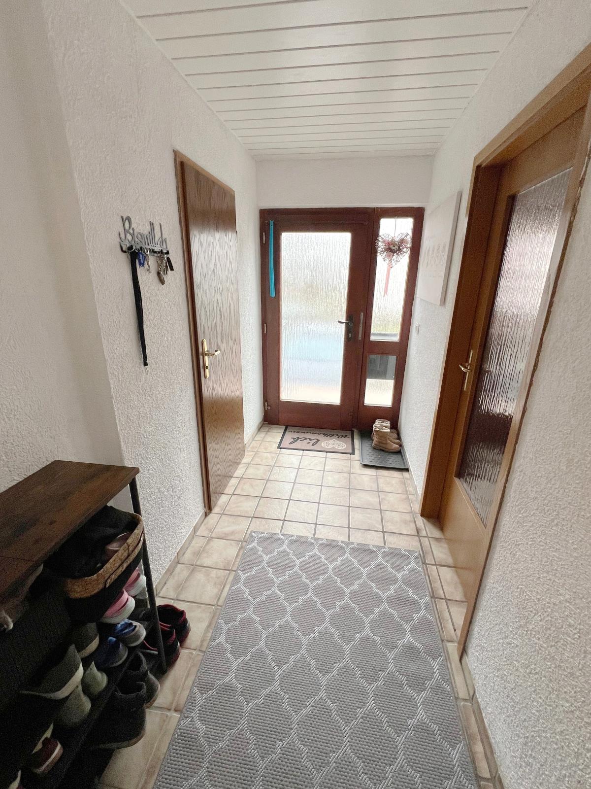 Sie parken Ihr Auto direkt vor dem Haus. Wenige Stufen führen Sie zur Haustüre. Im Windfang befindet sich das Gäste-WC und ein Garderoben-Bereich. Die Küche befindet sich gleich links. Von hier aus gibt es eine Tür zum Esszimmer. Die Räume sind hell und freundlich.