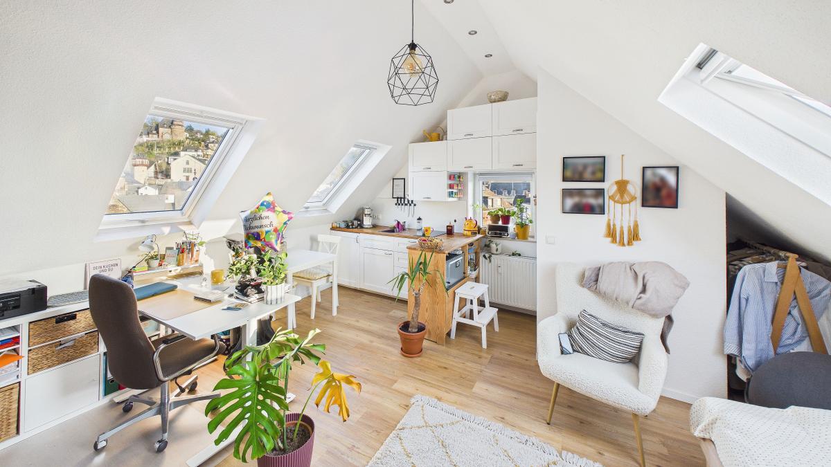 Dachgeschoss: Die oberste Wohneinheit besticht durch einen spektakulären, unverbaubaren Blick direkt auf die Festung Ehrenbreitstein.