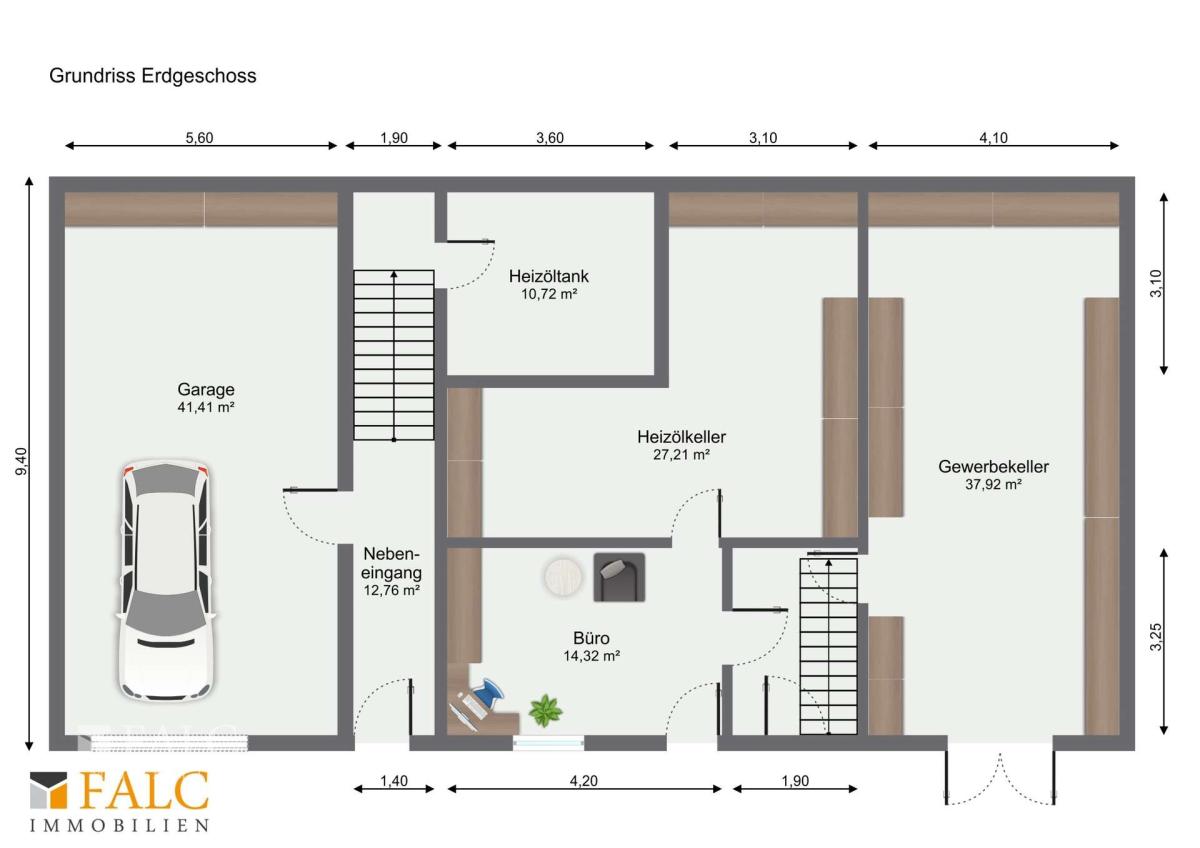 Das Erdgeschoss bzw. die Kellerebene bietet neben praktischen Nutzflächen auch besondere Ausstattungsmerkmale wie einen Gewölbekeller mit Außenzugang. Darüber hinaus befinden sich hier ein Büro, ein Heizungsraum sowie ein zusätzlicher Lagerraum. Die Beheizung erfolgt über eine Ölzentralheizung aus dem Jahr 1996 (Hersteller Viessmann).