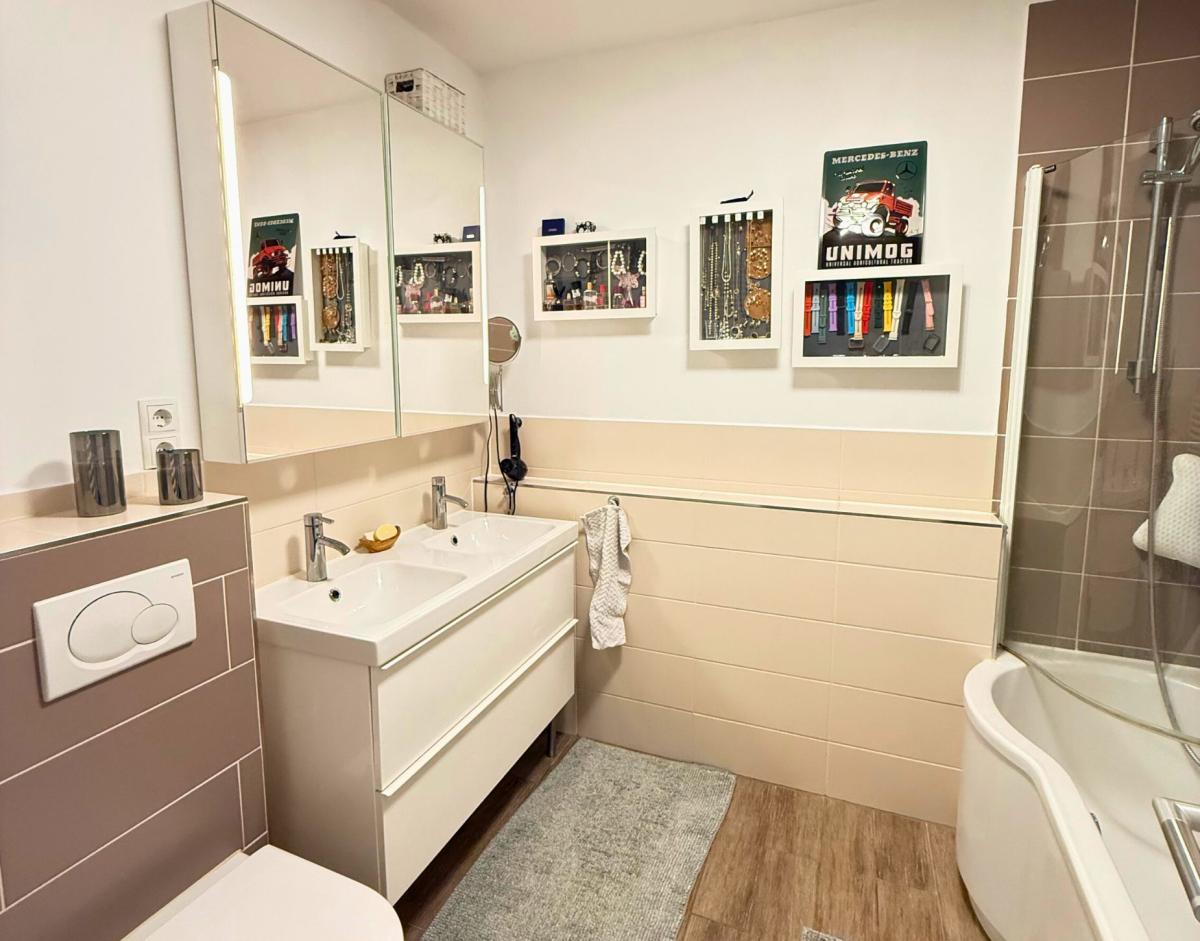 Das Bad ist modern gestaltet und bietet ausreichend Platz für deine Waschmaschine. Für warmes Wasser sorgt ein neuer, moderner Durchlauferhitzer – zuverlässig und effizient.