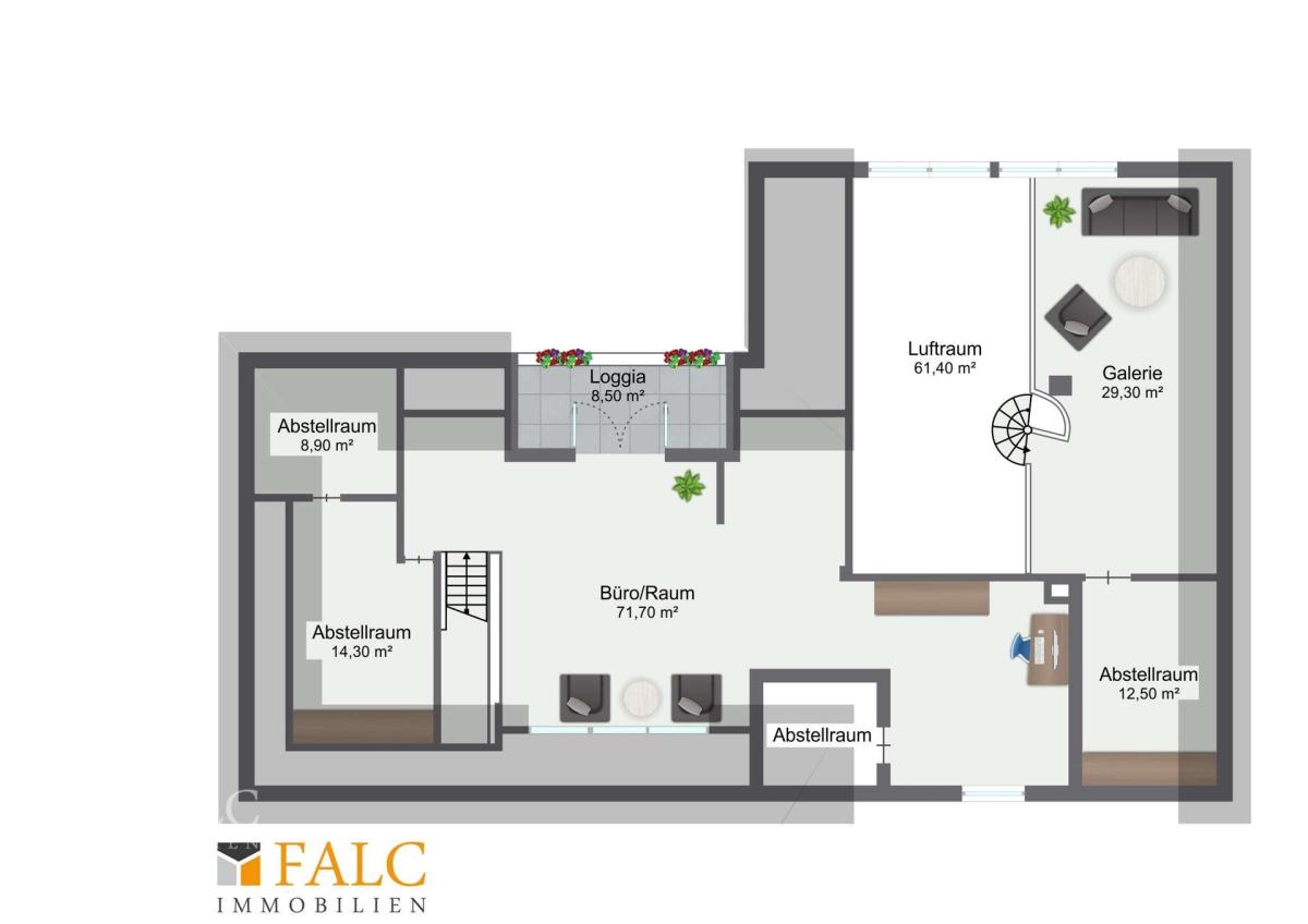 - Obergeschoss: zwei gut aufteilbare Bereiche mit Loggia, ideal fĂĽr BĂĽro-, Praxis- oder Ateliernutzung
