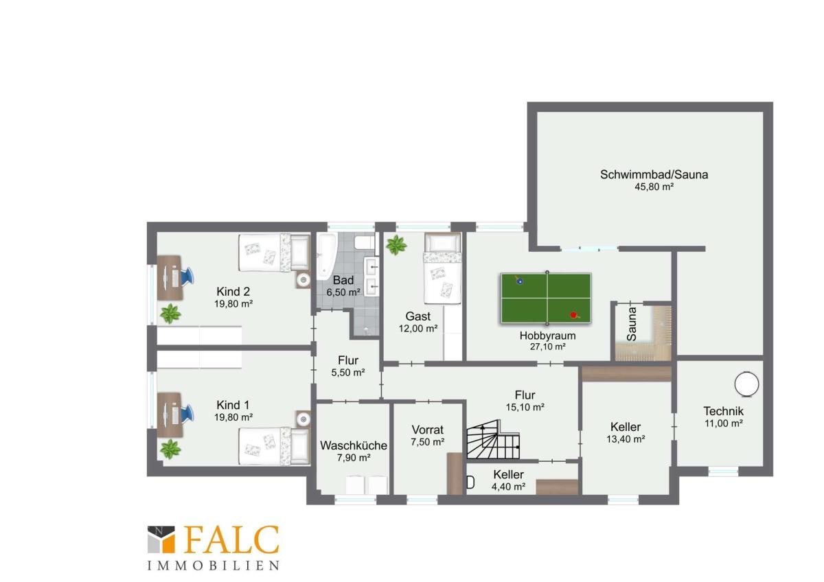 Ergänzt wird dieses Raumangebot durch zusätzliche Flächen von 128,10 m², die vielfältige Möglichkeiten eröffnen: Ein Waschraum, ein Abstellraum, ein Technik- bzw. Versorgungsraum, ein Arbeits- und Heizraum, eine Sauna mit Fitnessbereich sowie ein Indoor-Pool schaffen ein komfortables und zugleich exklusives Wohnambiente. Der Poolbereich bietet zudem Ausbaupotenzial und kann individuell weiterentwickelt werden.