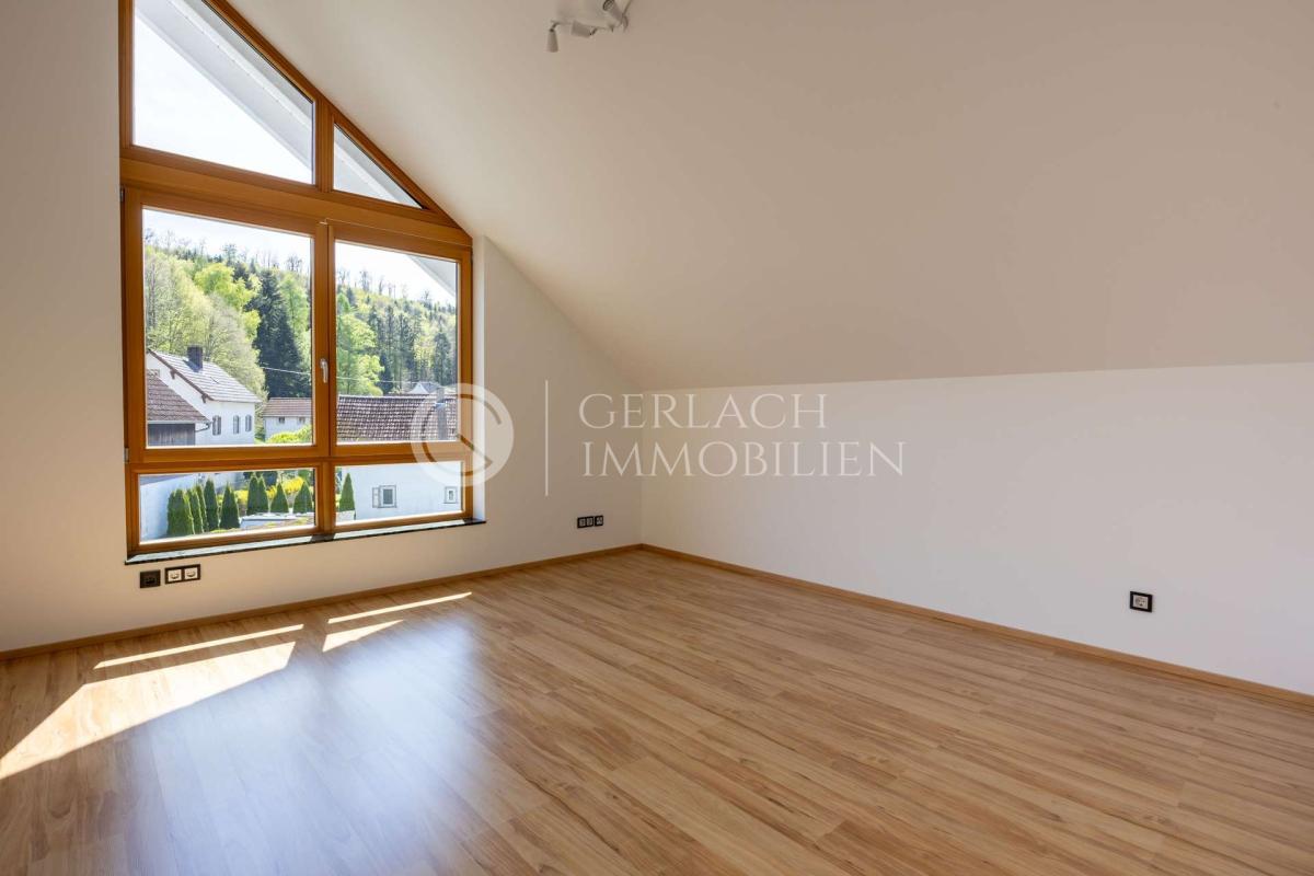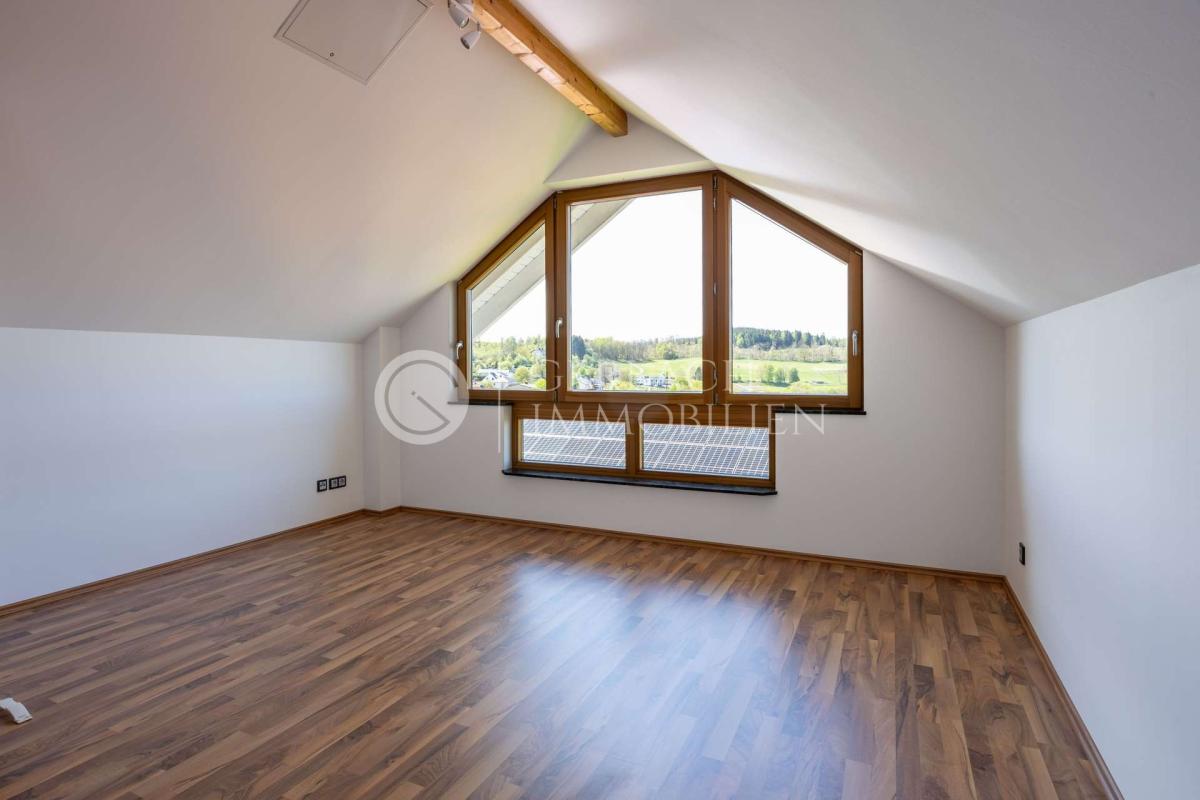 Im Dachgeschoss warten 3 helle geräumige Zimmer, eine Galerie mit Pellet-Ofen, das 2. Badezimmer und der private Elternbereich mit Schlafzimmer, Ankleide und Balkon – ein Ort zum Durchatmen und Abschalten.