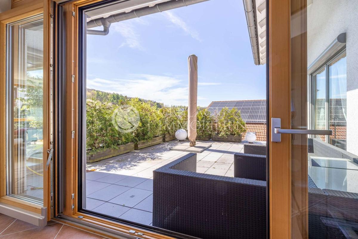 Die Hauptwohnung ist großzügig, offen und hell. Bodentiefe Fenster holen die Natur hinein, der Kamin spendet Wärme, und die offene Küche mit Kochinsel wird schnell zum Mittelpunkt des Familienlebens. Auf den Terrassen, die sich ringsum anschließen, genießt man Sonne, Weitblick und die Ruhe des Ortes.