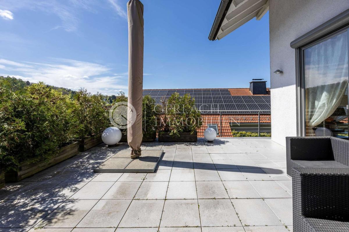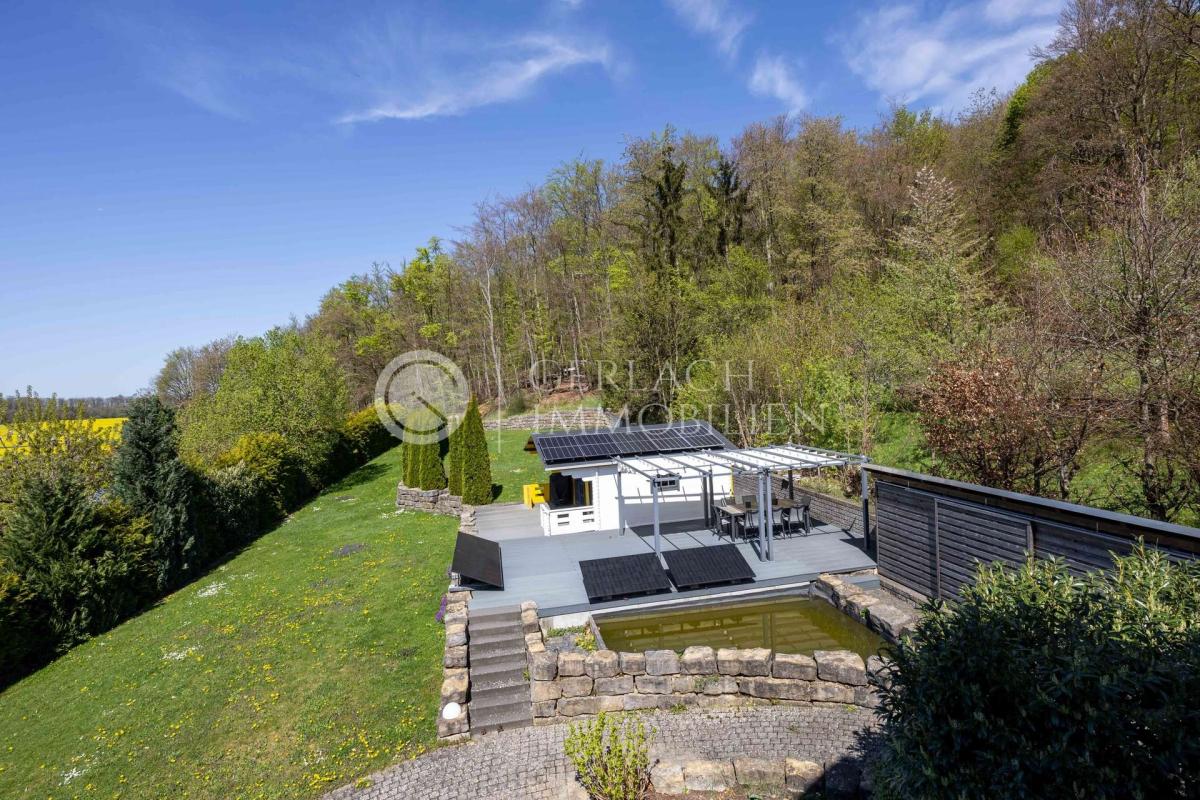 Auch der Außenbereich überzeugt mit mehreren Terrassen, einem gepflegten Garten und einem großen Gartenhaus mit Photovoltaikanlage und Speicher. Hier ist Platz zum Genießen, Spielen, Arbeiten oder einfach zum Innehalten.