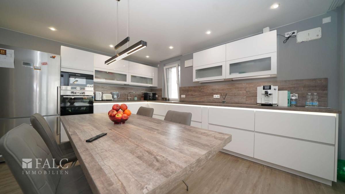 Die moderne Küche präsentiert sich in elegantem Weiß und wird durch eine hochwertige Arbeitsplatte in warmer Holzoptik stilvoll ergänzt. Neben viel Stauraum bietet sie zudem hochwertige Markengeräte der Firma Bosch und lässt damit sowohl funktional als auch optisch kaum Wünsche offen. Große Fensterflächen lassen viel Tageslicht in den Raum strömen und schaffen eine helle, freundliche Wohnatmosphäre.