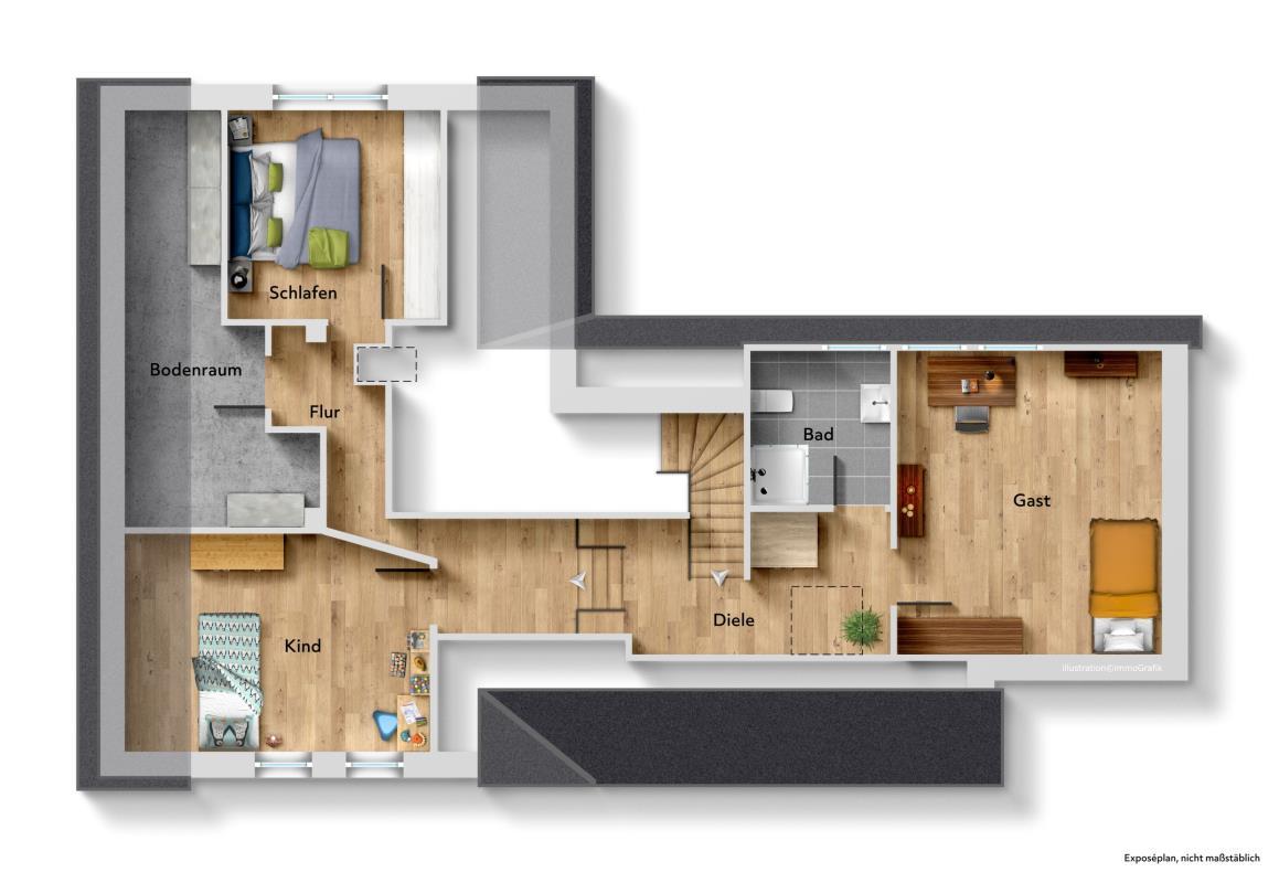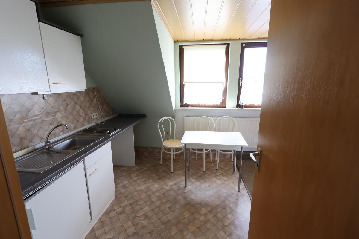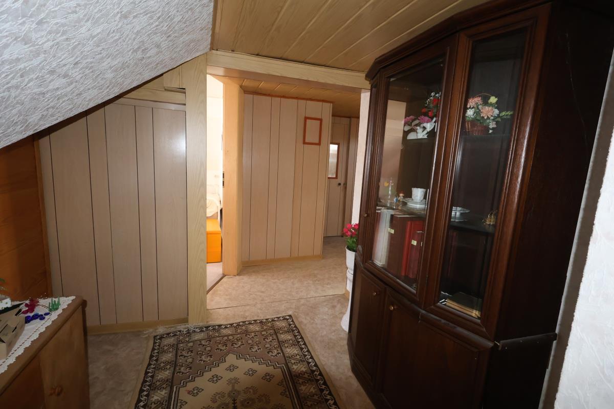 Im Anbau führt die Treppe in das Dachgeschoss. Dort sind zwei Schlafräume, ein kombinierter Wohn-Schlafraum mit Kochecke, ein Duschbad sowie der Flur vorhanden.