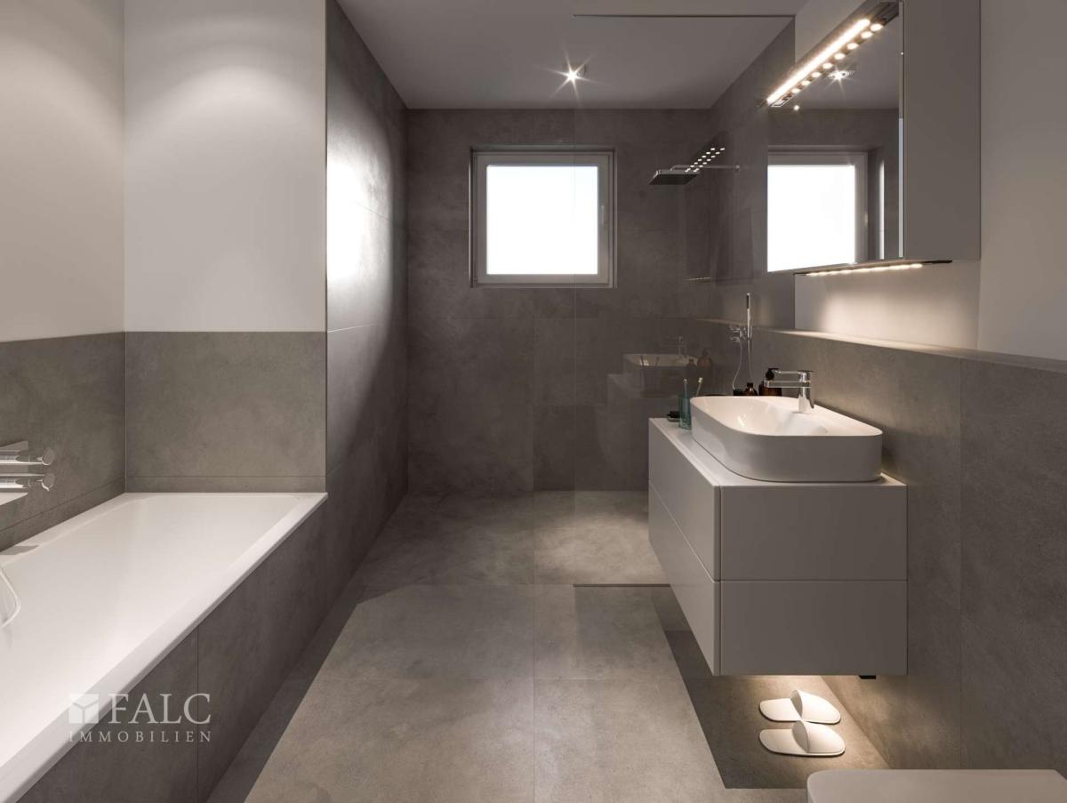 Das Bad verfügt über eine bodengleiche Dusche mit Glas, Wanne, Waschtisch mit Unterschrank und WC von Villeroy & Boch. Die hochwertigen Armaturen von Grohe und die vorhandene vollständige Ausstattung des Bades sind im Kaufpreis inbegriffen.