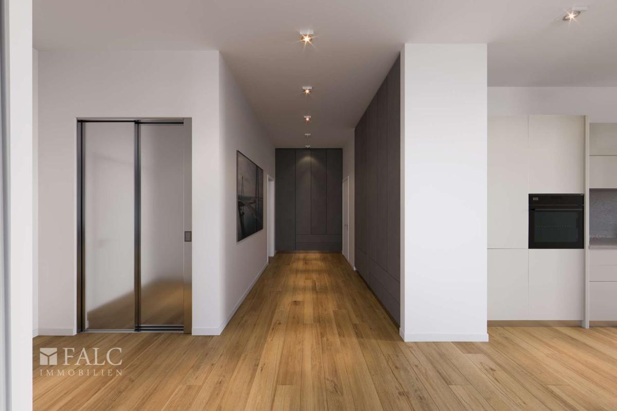 Ein repräsentatives Entrée mit Videosprechanlage, weiß lackierte ca. 2,11 m hohe Innentüren, halb offene Architektur, bodentiefe Fenster, eine große Dachterrasse, Küche, hochwertigste Materialien - wer dies zu schätzen weiß, ist hier goldrichtig!