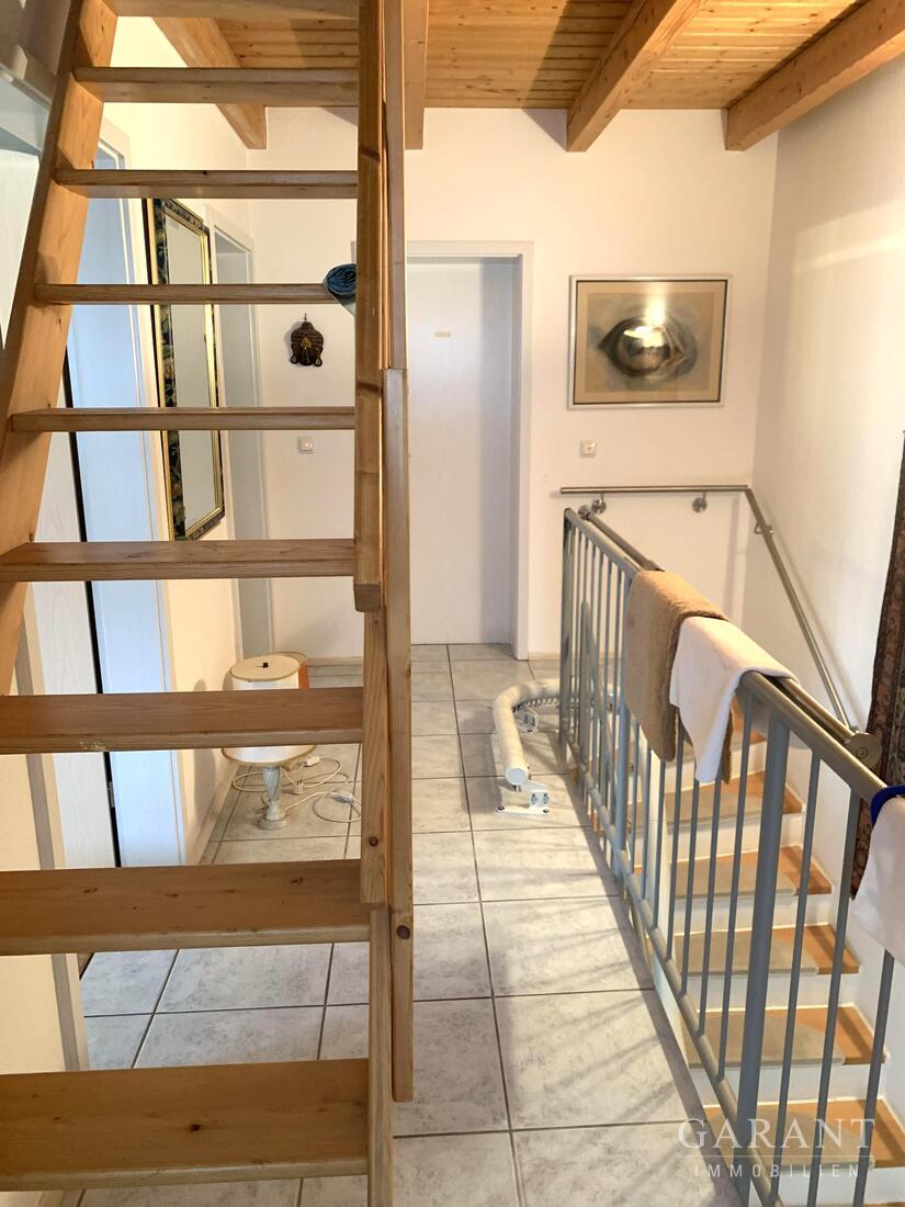liegt Parkett. Die Südterrasse ist fast uneinsehbar und der kleine Grünbereich macht nicht viel Arbeit, dennoch sitzen Sie sonnig im Grünen. Über eine massive, weisse Treppe mit Buchenholzstufen geht es zum Schlafbereich, hier erwartet Sie ein großzügiges Badezimmer, ebenfalls mit Fußodenheizung. Zwei schöne Schlafräume mit heller Sichtbalken-Decke und ein Arbeitszimmer - diese Räume wurden mit hochwertigem Korkboden ausgestattet. Eine leichte Treppe führt in den hell ausgebauten Speicher, der durchaus als Hobbyraum, zweiter Arbeitsplatz oder als geräumiges Jugndzimmer genutzt werden kann.