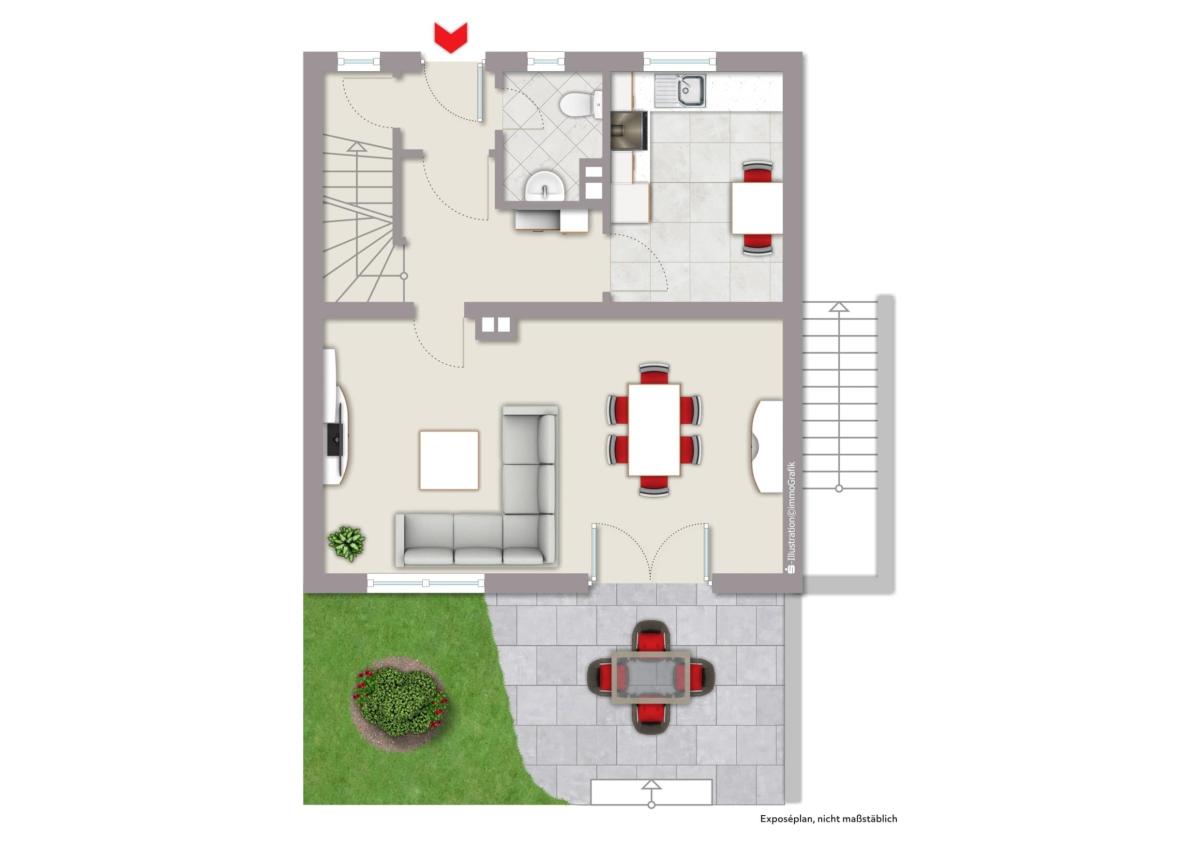 Erdgeschoss: Flur, GWC, Küche, Wohn-Esszimmer mit Zugang zum Wintergarten und