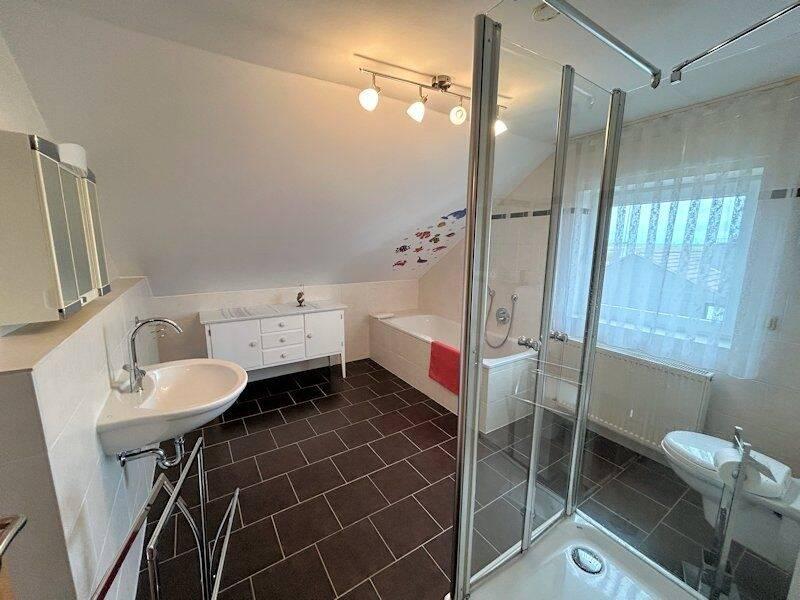 Weiterhin ist das Dachgeschoss noch wohnlich ausgebaut mit einem großen hellen Bad und 2 Räumen.