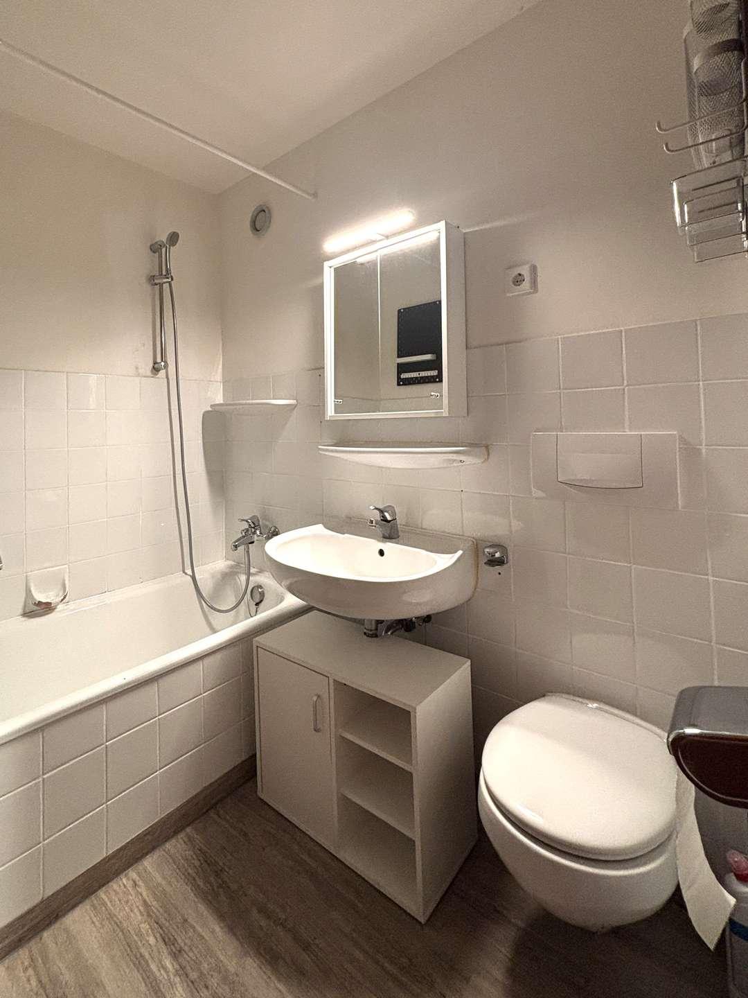 Beim Betreten gelangen Sie zunächst in einen Windfang, der ausreichend Platz für eine Garderobe oder einen schmalen Schrank bietet. Direkt auf der rechten Seite befindet sich das innenliegende Badezimmer, ausgestattet mit einer Duschwanne und funktional geschnitten.