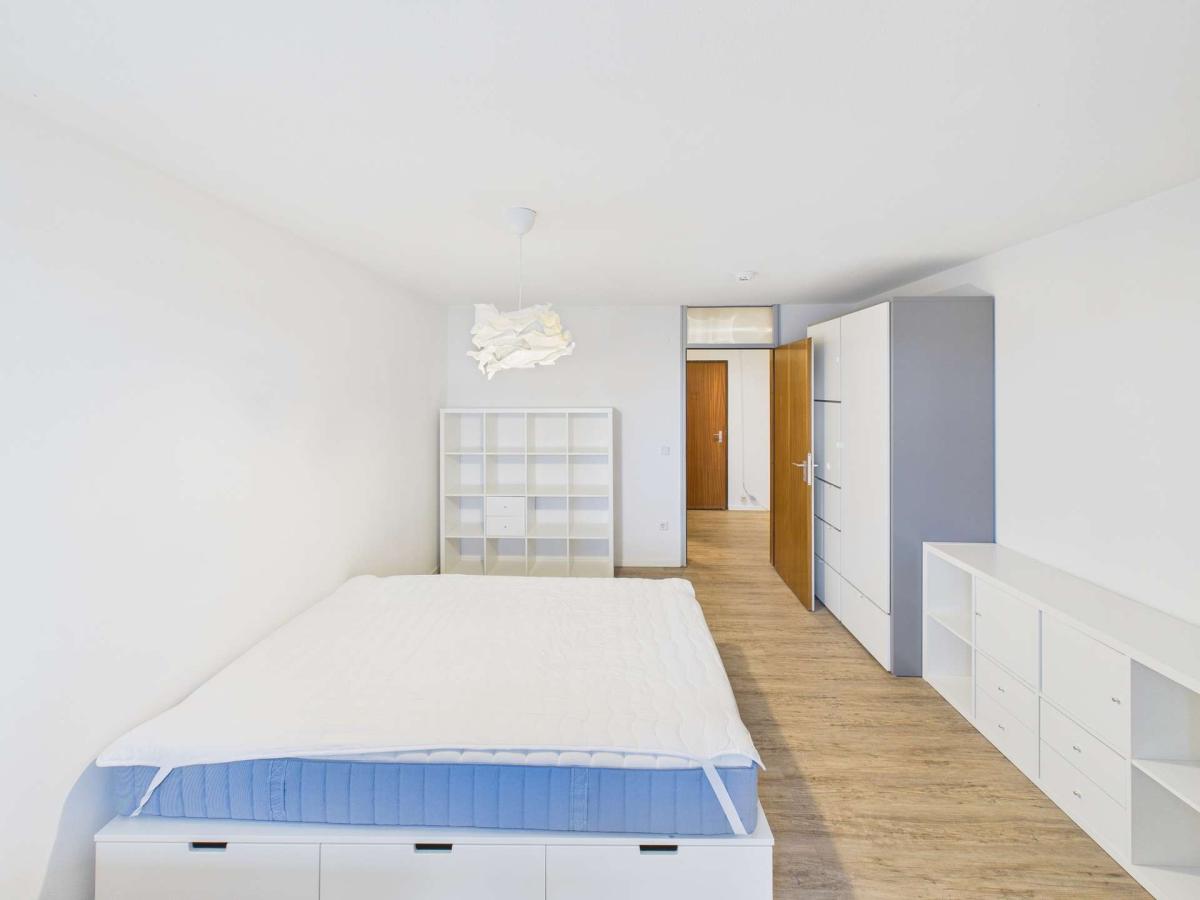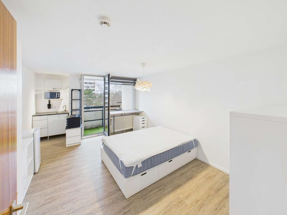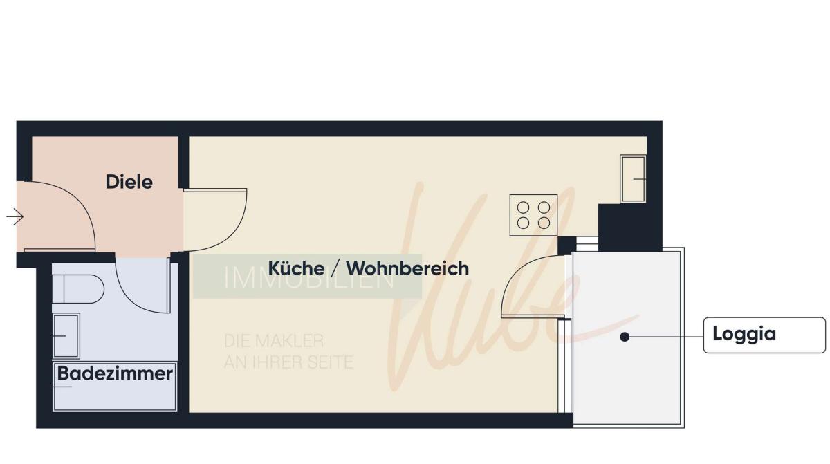Geradeaus öffnet sich das Wohn- und Schlafzimmer mit integrierter Kochnische. Der Raum lässt sich flexibel gestalten und bietet genügend Fläche, um Wohnen, Schlafen und Arbeiten sinnvoll miteinander zu kombinieren. Von hier aus haben Sie Zugang zur Loggia, die als geschützter Außenbereich zusätzlichen Wohnkomfort schafft und sich ideal für eine kleine Sitzgelegenheit eignet.