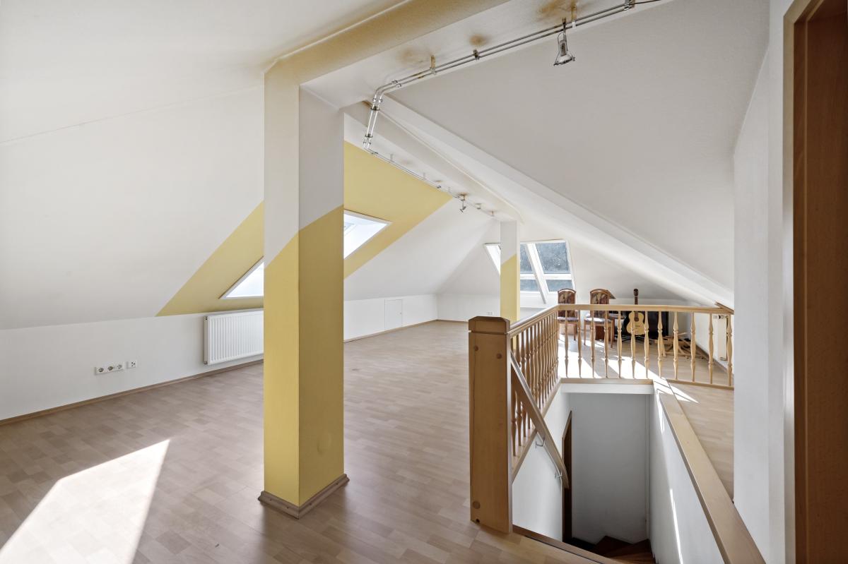 Über den Flur zu den Schlafräumen gelangen Sie in ein ausgebautes Galeriezimmer im Dachgeschoss. Ein weiteres Zimmer wurde bereits zum Ausbau vorbereitet und verfügt neben ausreichend Tageslicht bereits über einen Heizkörper.