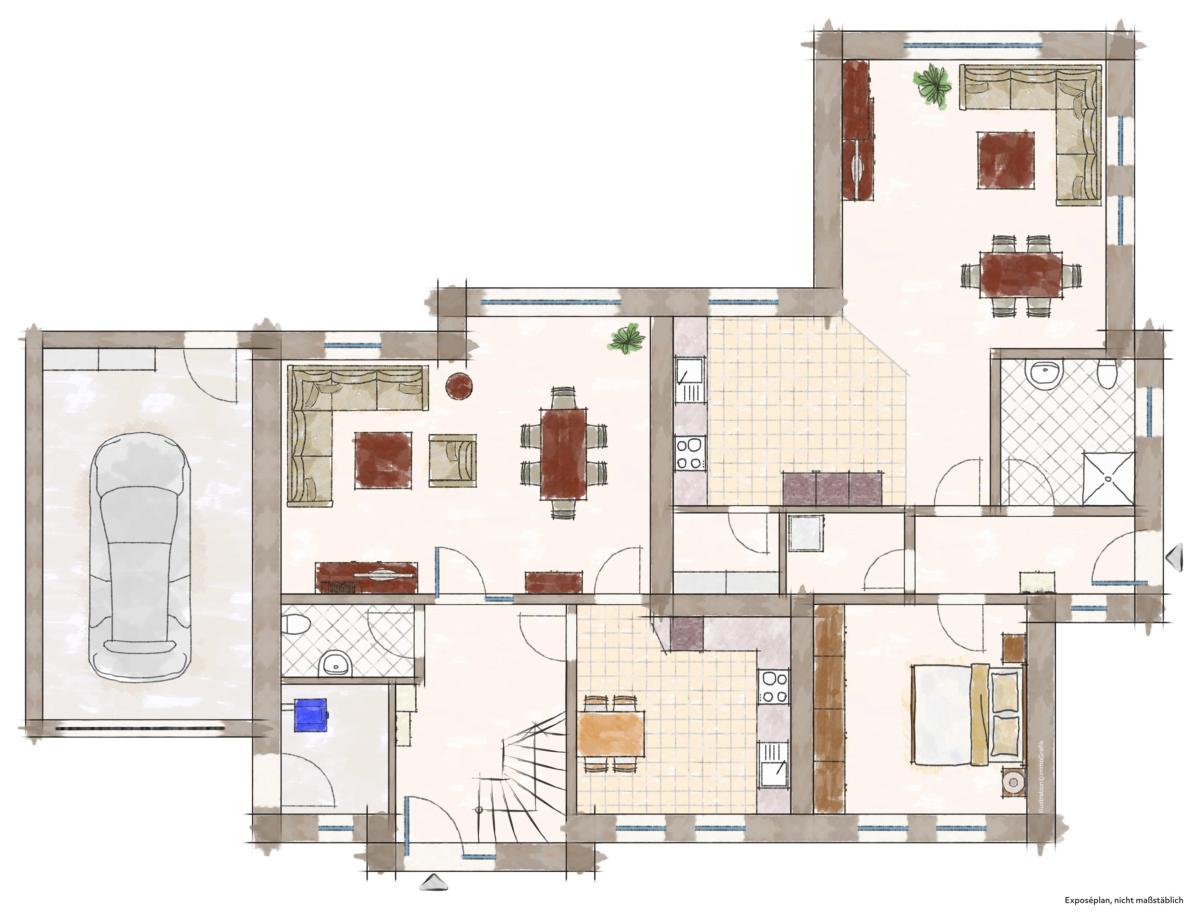 Der Mittelpunkt des Hauses ist das helle und gemütliche Wohn- und Esszimmer. Angrenzend befindet sich die Küche mit Kochinsel. Im Eingangsbereich mit Gäste-WC und Garderobe führt Sie eine elegante Granittreppe ins Dachgeschoss.