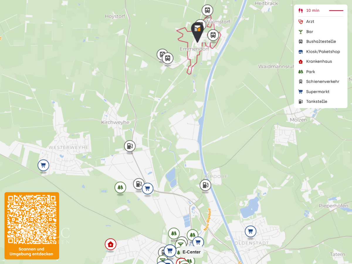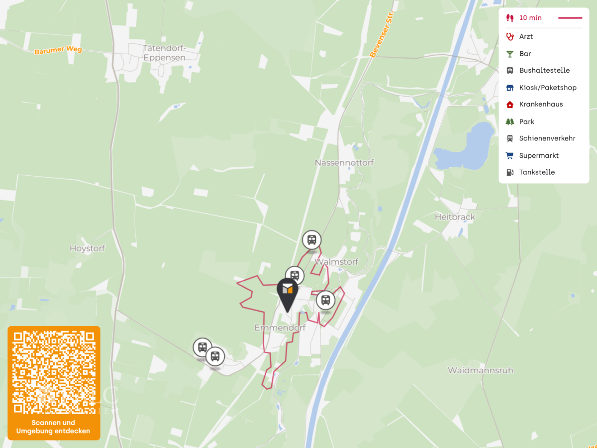 Die Immobilie in der Bahnhofstraße 9, 29579 Emmendorf überzeugt durch eine ruhige, ländlich geprägte Umgebung mit guter Anbindung an die nahegelegenen Zentren. Für den Alltag liegt die Bushaltestelle Emmendorf Ortsmitte in ca. 300 m Entfernung, eine weitere Haltestelle an der Alten Salzstraße erreichen Sie nach ca. 400 m. So sind Sie flexibel unterwegs, auch ohne Auto.
