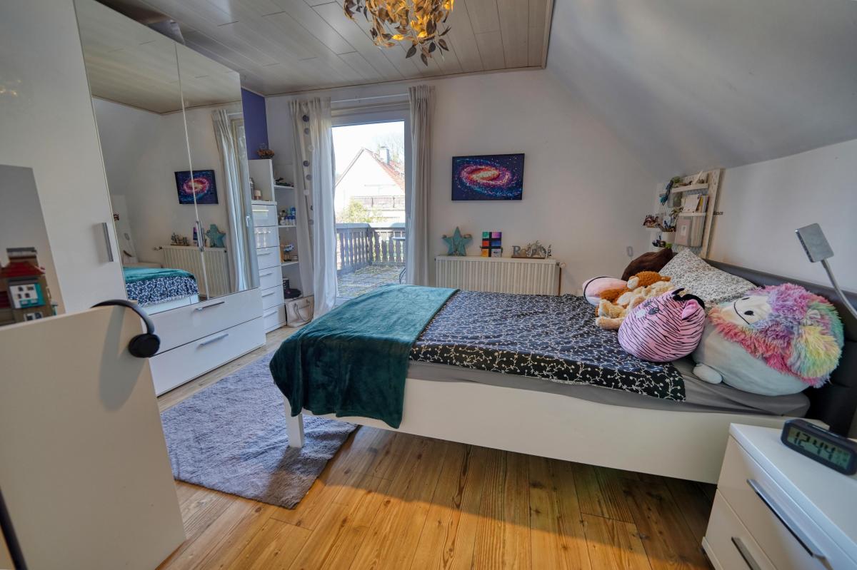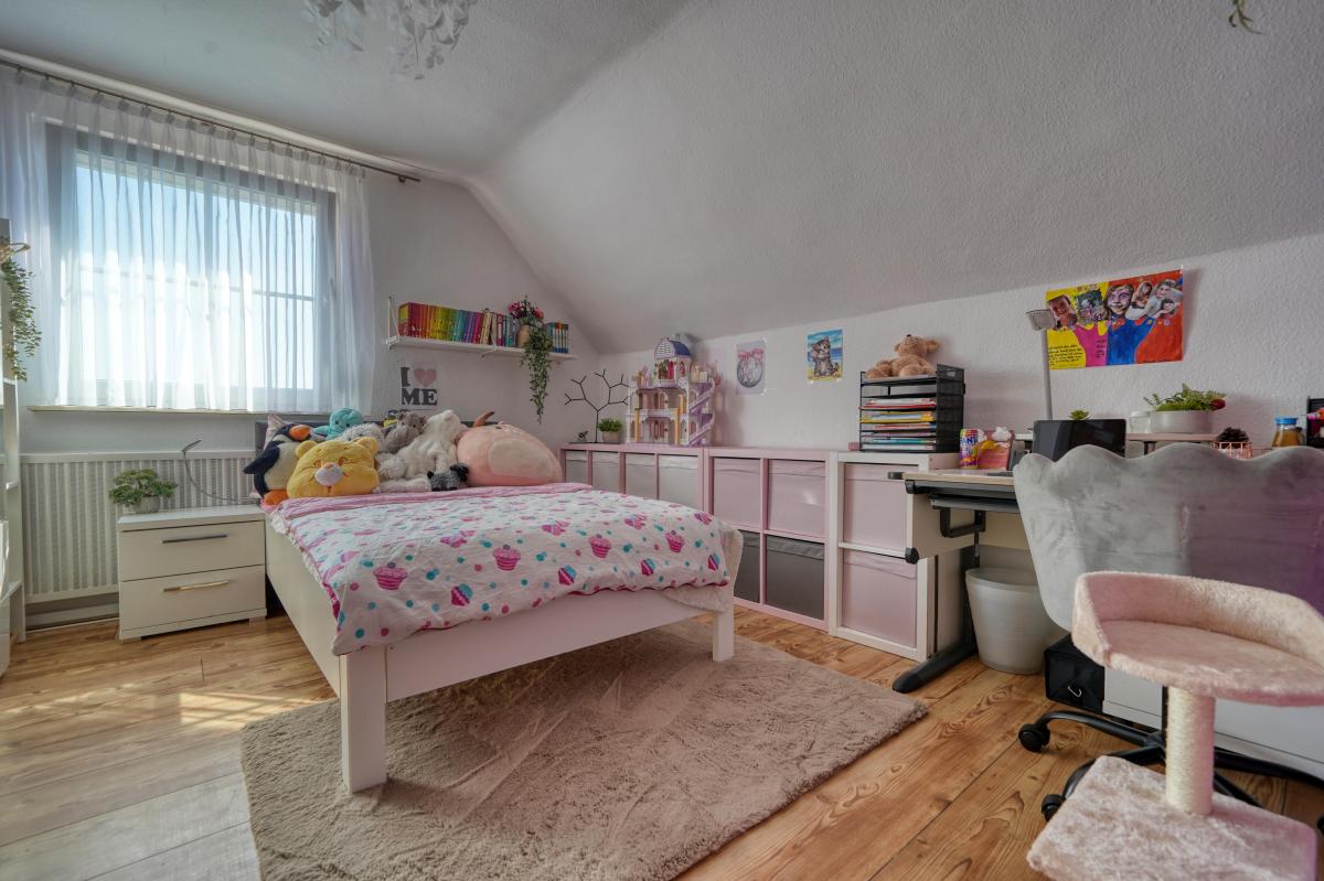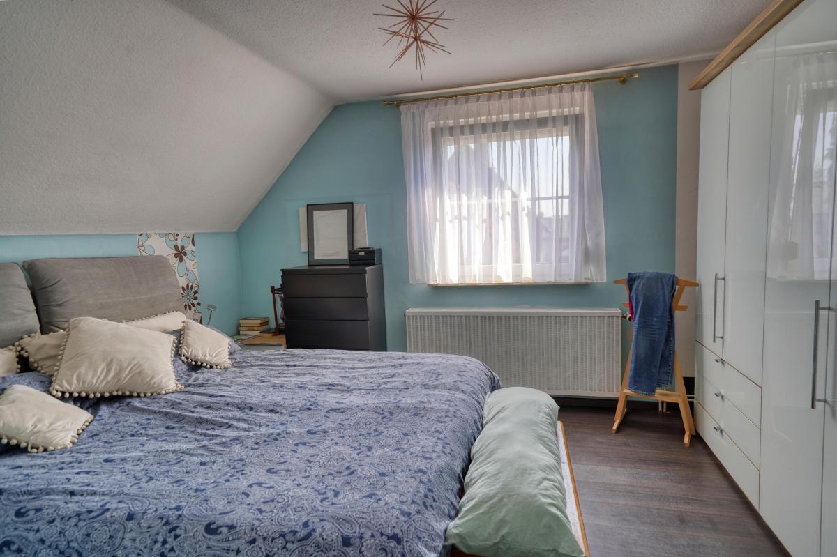 Über die Treppe im Flur erreichen Sie das Obergeschoss. Hier verteilen sich insgesamt 3 Zimmer. Vom oberen Flur aus gelangen Sie in die drei gut geschnittenen Zimmer, die sich ideal als geräumiges Hauptschlafzimmer sowie als lichtdurchflutete Kinder- oder/und Arbeitszimmer eignen.