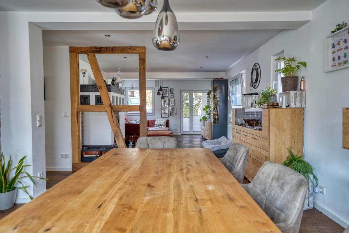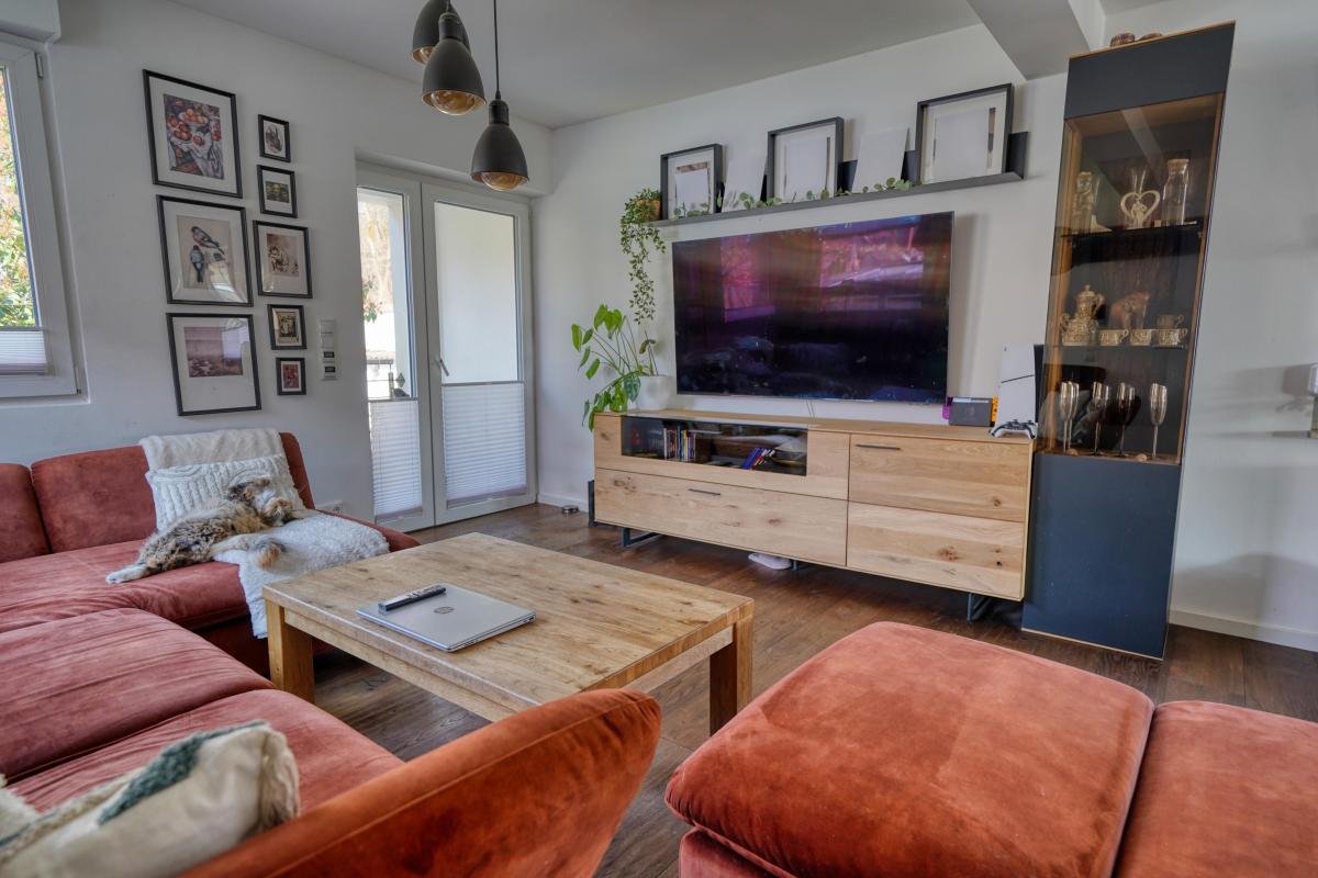Das Herzstück des Hauses ist das großzügige Wohnzimmer. Es ist hell, freundlich und mit großen Fenstern ausgestattet, die einen wunderbaren Blick auf das große Grundstück freigeben. Von hier aus gelangen Sie direkt in den Garten – ideal für entspannte Familienabende, Gartenpartys oder ruhige Stunden im Grünen.
