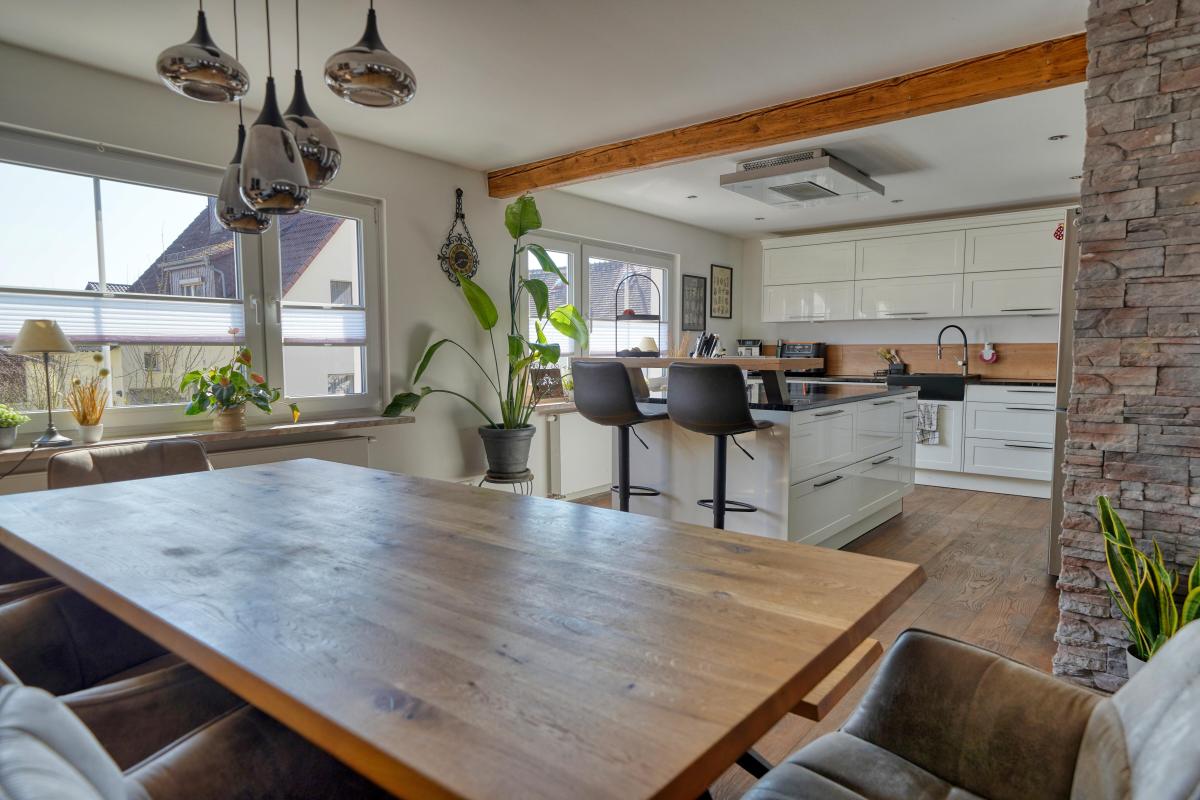 Die Küche befindet sich praktischerweise auf der rechten Seite des Wohnbereichs. Sie ist offen gestaltet und bietet genug Platz, um gemeinsam zu kochen und Gäste zu bewirten. Durch die räumliche Nähe zum Wohnbereich bleiben Sie auch beim Zubereiten der Speisen immer Teil des Geschehens.