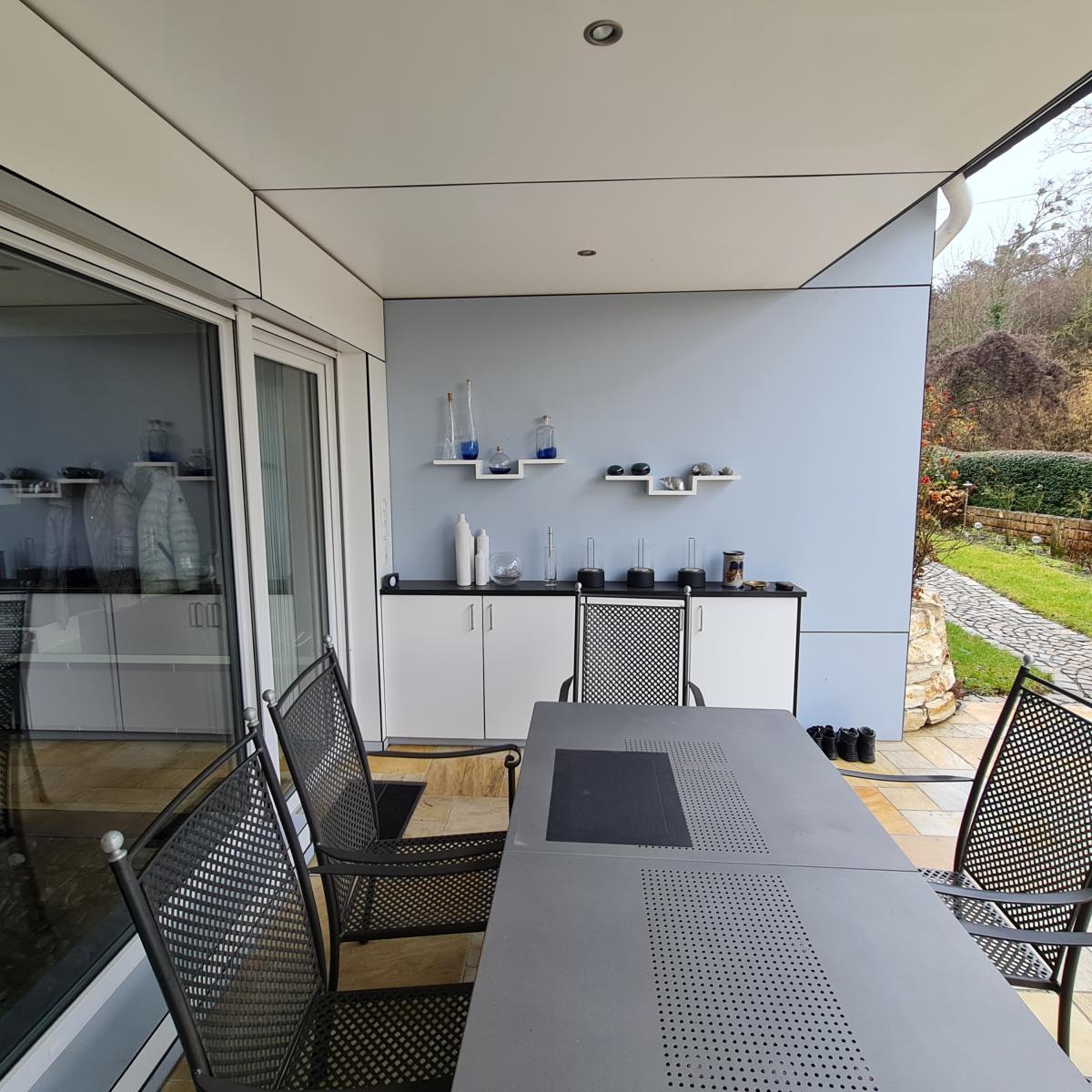 Der einladende Wohn- und Essbereich mit gemütlichem Kamin bildet das Herzstück des Hauses - ideal für gesellige Abende und entspannte Stunden. Von hier aus gelangen Sie in den sonnendurchfluteten Wintergarten sowie auf die weitläufigen Terrassen, die zu gemütlichen Grillabenden oder zum Sonnen einladen.