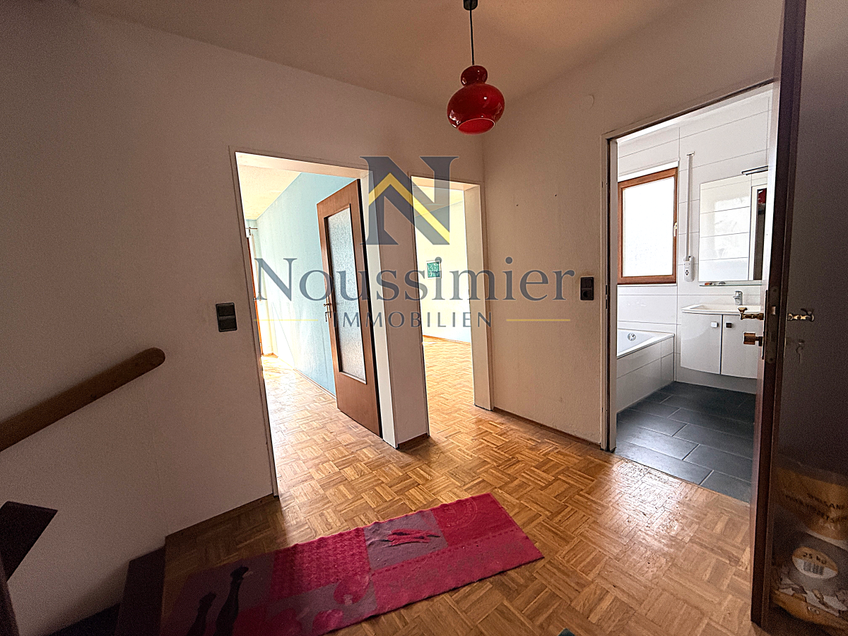 Im ersten Obergeschoss befinden sich ein geräumiges Elternschlafzimmer sowie zwei helle Kinderzimmer, die sich um das frisch sanierte Hauptbadezimmer gruppieren. Ein besonderes Highlight erwartet Sie im Dachgeschoss: Die galerieartige Gestaltung mit einem zweiten Wohnzimmer und zwei weiteren Zimmern bietet maximale Flexibilität für Kinder, Gäste oder ein großzügiges Home-Office. Die holzverkleideten Fenster unterstreichen dabei den charmanten Charakter des Hauses.