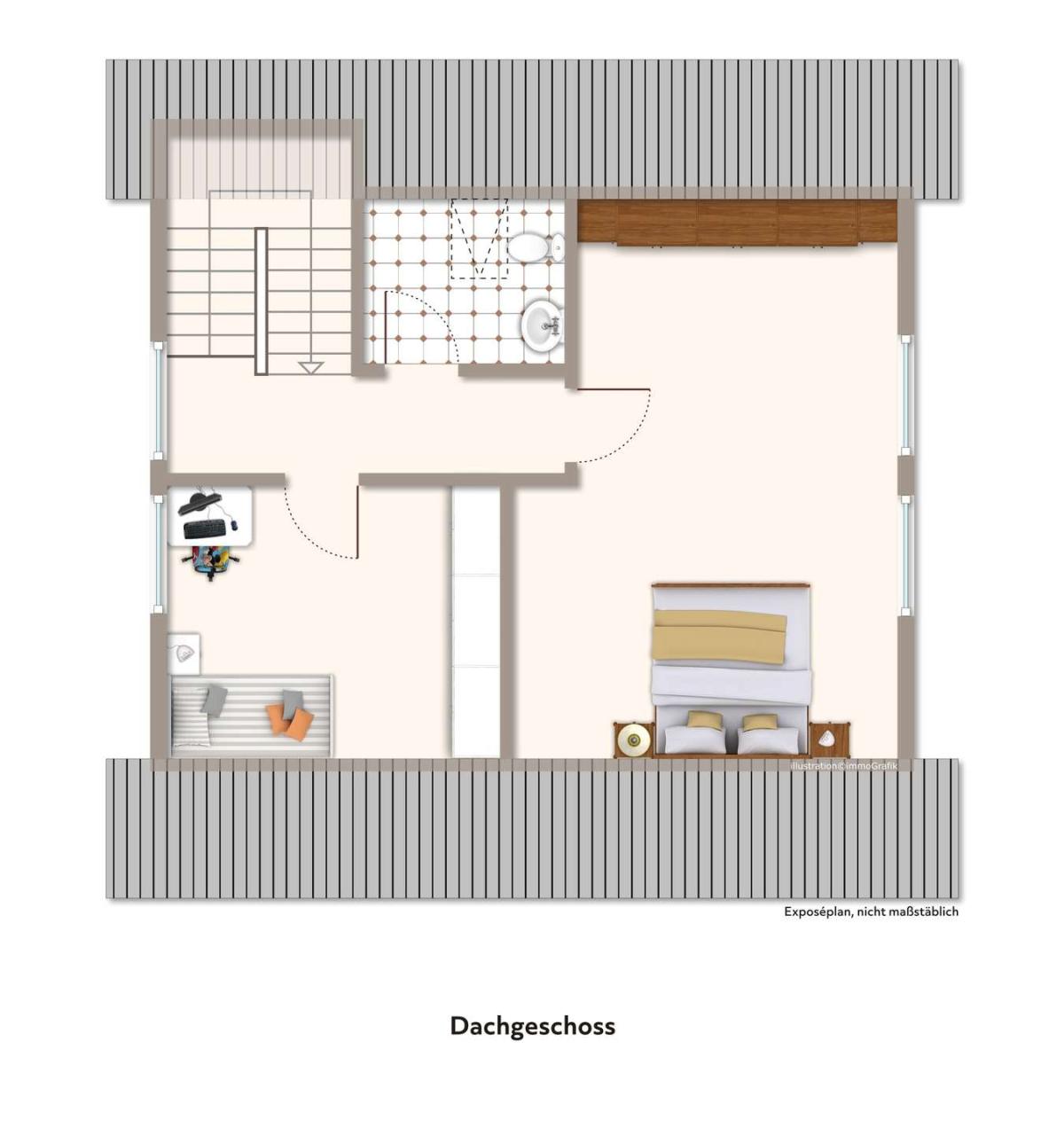 Im Dachgeschoss befinden sich zwei weitere Zimmer in unterschiedlicher Größe (ca. 22 m² und ca. 10 m²) und ein Gäste-WC.