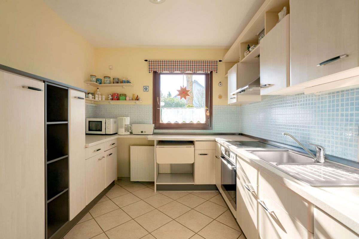 In der hellen Küche, deren freundliche Fronten das Licht sanft reflektieren, startet der Tag ganz entspannt – vielleicht mit einer Tasse Kaffee und dem Blick ins Grüne. Das Erdgeschoss überzeugt durch eine durchdachte Aufteilung: Ein Gäste-WC sowie ein praktischer Hauswirtschaftsraum, in dem die Haustechnik zuverlässig ihren Dienst verrichtet, sorgen für Komfort im Alltag.