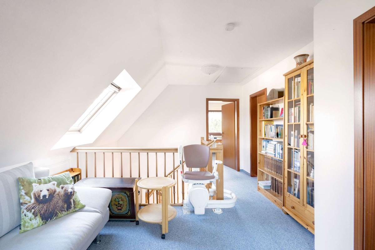 Wenn der Tag ausklingt, führt die Treppe – unterstützt durch einen bereits installierten Treppenlift – bequem ins Obergeschoss. Dieser bietet nicht nur Komfort im Alltag, sondern eröffnet auch langfristige Nutzungsmöglichkeiten für verschiedene Lebensphasen.
