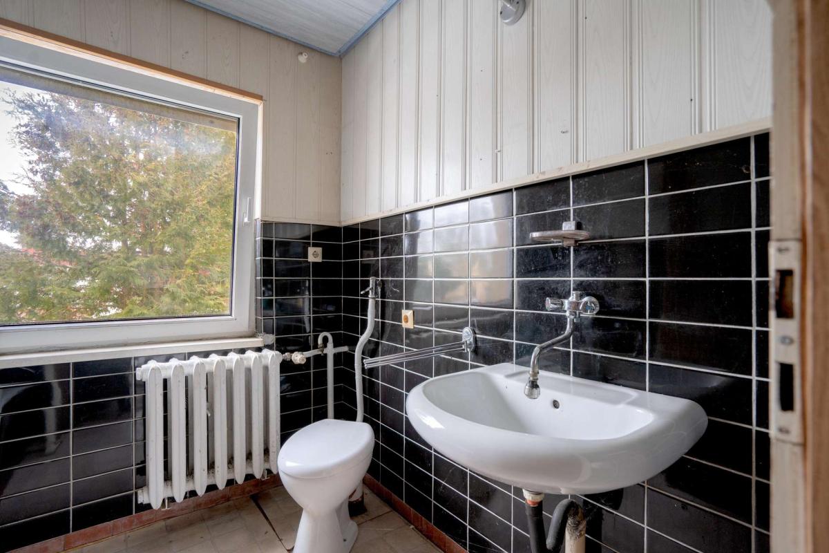 Die Wohnetage wird über einen Anbau betreten. Von hier aus gelangt man in einen schmalen Flur, von dem aus alle Räume dieser Ebene erreichbar sind. Das Wohnzimmer ist großzügig geschnitten und dank eines bodentiefen Fensters besonders hell. Von hier aus gelangt man direkt auf die Terrasse und in den Garten. Ein vorhandener Kamin sorgt zusätzlich für eine gemütliche Atmosphäre und unterstreicht den Wohncharakter des Raumes. Auf dieser Etage befinden sich außerdem vier weitere Zimmer, die sich flexibel als Schlaf-, Kinder-, Arbeits- oder Gästezimmer nutzen lassen. Einer der Räume ist für die Einrichtung einer Küche vorgesehen. Das Tageslichtbadezimmer ist mit einer Badewanne ausgestattet. Die Wände im Haus weisen derzeit Feuchtigkeitsschäden auf, sodass insgesamt ein Sanierungsbedarf besteht. Die Fenster der gesamten Wohnetage sind mit außenliegenden, manuell bedienbaren Rollläden ausgestattet.