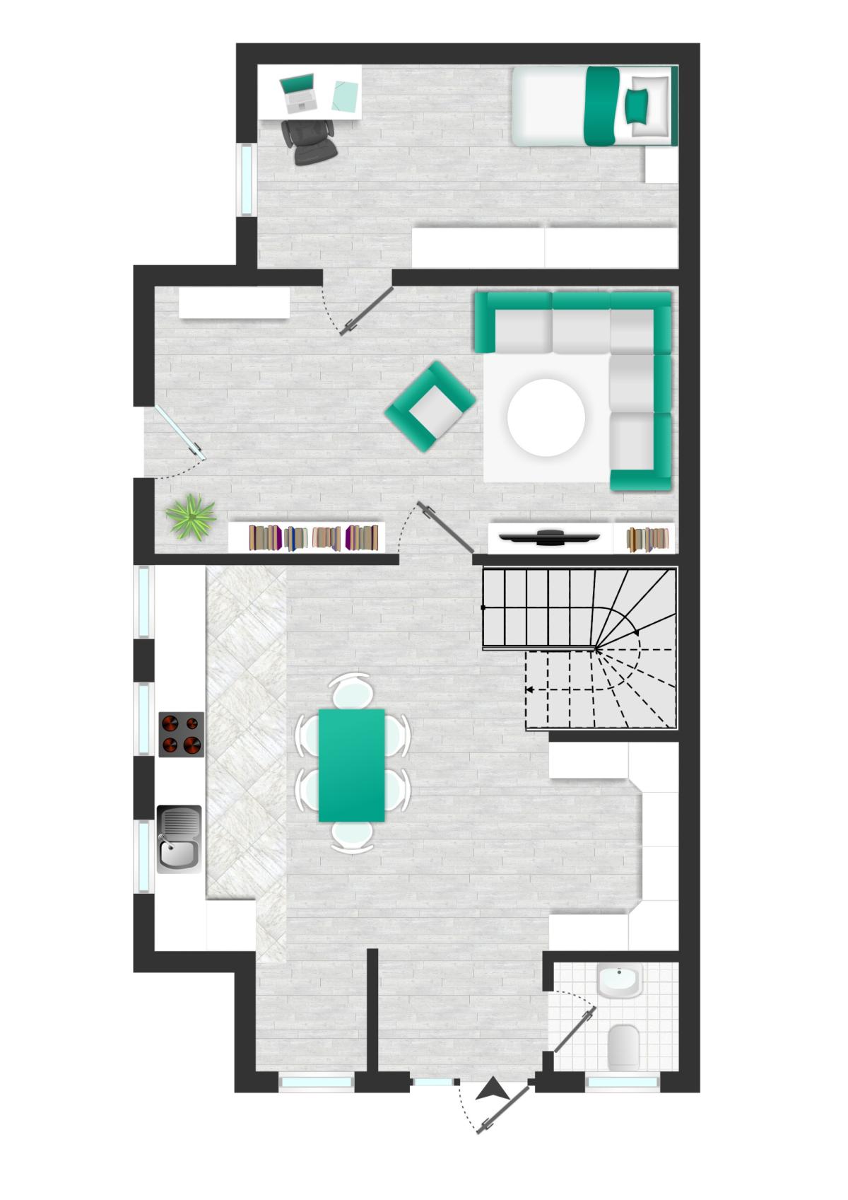 Im Erdgeschoss gelangt man über einen praktischen Windfang in den Eingangsbereich mit großzügigem Büroraum, einem Kunden-WC sowie einem Lager-/Hausanschlussraum.
