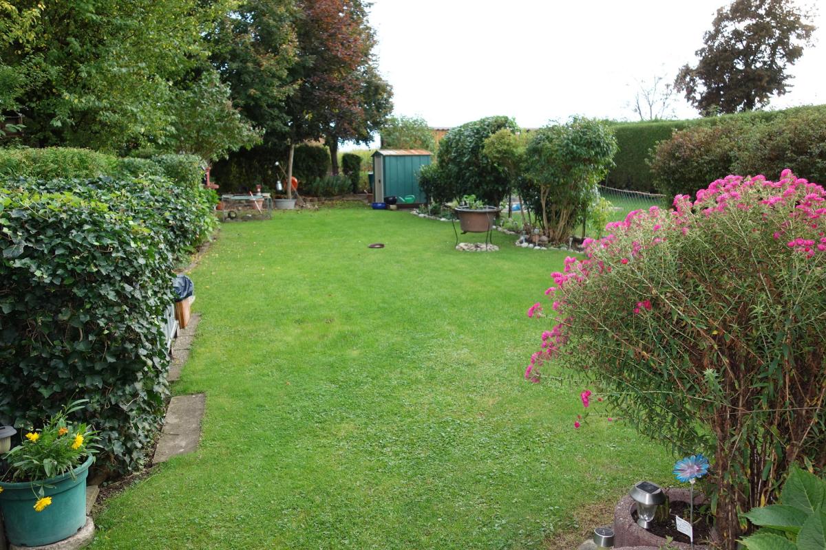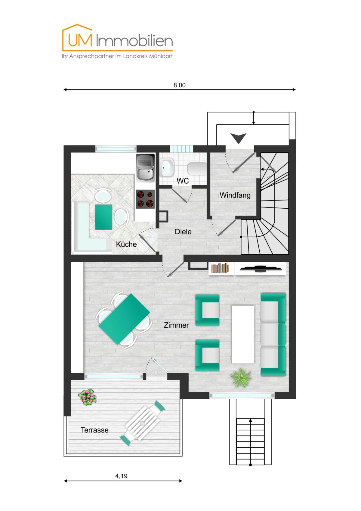 Nach dem Eingang kommt der Windfang, eine kleine Garderobe sowie das Gäste-WC. Vom Treppenhaus erreichen Sie weiteren Räume. Das Wohn-/ Esszimmer, sowie die Küche. Vom Wohnzimmer gelangen Sie auf die Terrasse und den gepflegten Garten.