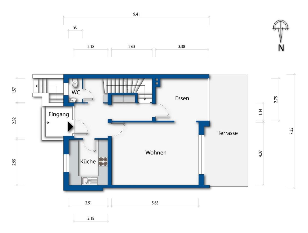 Hier erwartet Sie Ihr neues Zuhause mit einer Breite von 7,35m - also gar nicht typisch Reihenhaus. Die Räume sind entsprechend großzügig und hell und eher quadratisch als schlauchig geschnitten. Im Erdgeschoss finden Sie neben Küche, Wohn- und Esszimmer eine Garderobe und ein Gäste-WC.