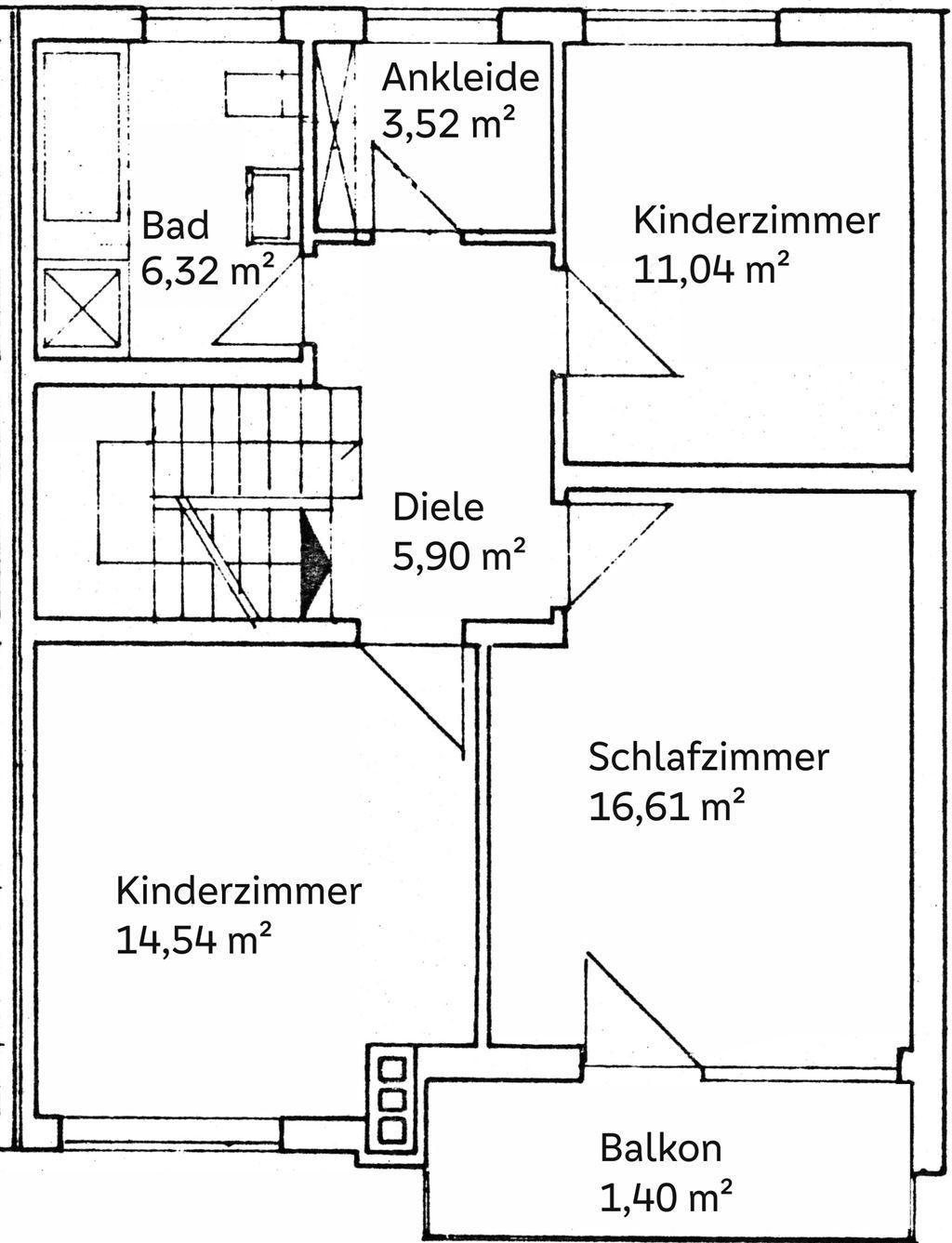Das Obergeschoss umfasst zwei Kinderzimmer, ein Schlafzimmer mit direktem Zugang zum Balkon sowie ein Badezimmer mit Badewanne und Dusche.