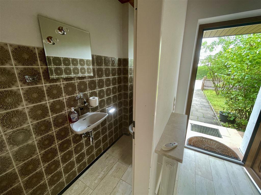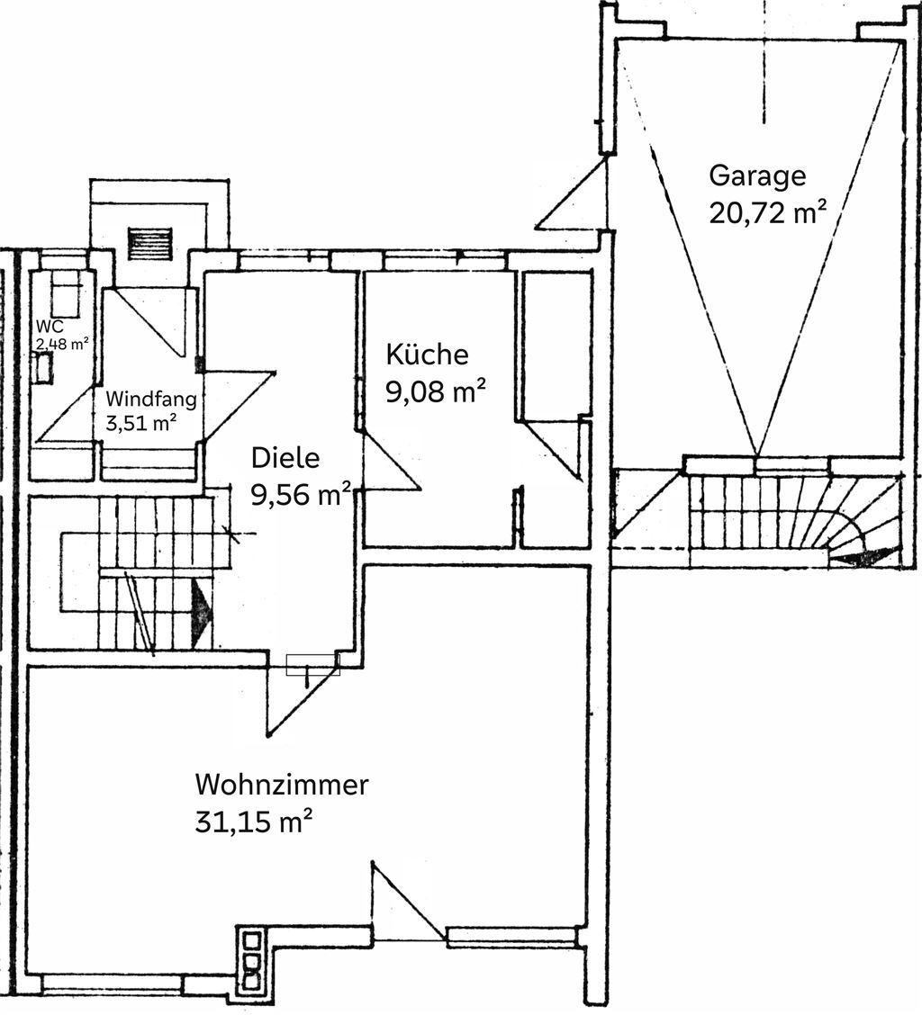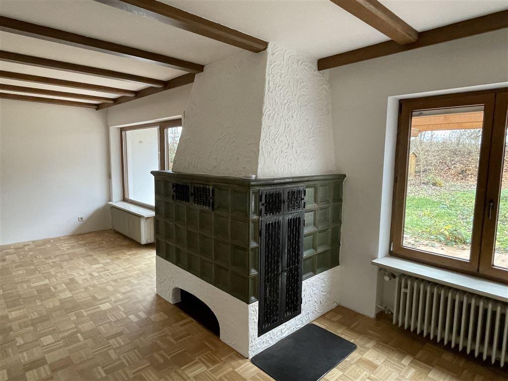 Der Eingangsbereich mit Windfang und angrenzendem Gäste-WC führt in eine großzügige Diele. Die separate Küche ist mit einer Speisekammer ausgestattet und bietet zusätzlichen Platz für Vorräte. Herzstück des Hauses ist der großzügige Wohnbereich mit ca. 31 m², der dank Kachelofen eine besonders behagliche Wohnatmosphäre schafft und direkten Zugang zur sonnigen Gartenterrasse bietet.
