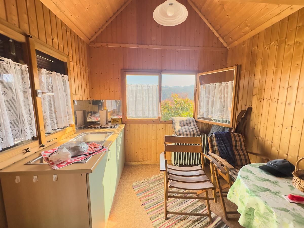 Ca. 2001 wurde im zentralen Bereich des Grundstücks eine Fläche eingeebnet und mit einer praktischen Hütte bebaut. Die Hütte überzeugt durch eine durchdachte und funktionale Ausstattung: