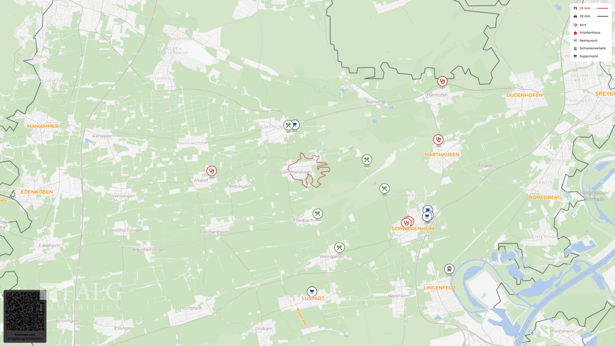 Für die tägliche Mobilität ist der öffentliche Nahverkehr schnell erreichbar: Die Bushaltestelle Gommersheim Dorfplatz liegt in ca. 300 m Entfernung, weitere Haltepunkte wie Hauptstraße und Friedhof sind ebenfalls in ca. 700 m erreichbar. Damit sind Fahrten in die umliegenden Orte unkompliziert möglich, ohne auf das Auto angewiesen zu sein.
