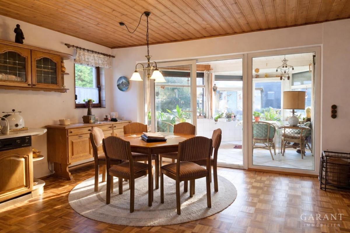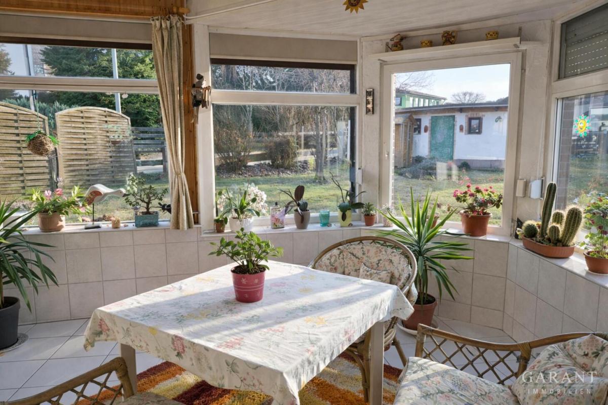 Das Haus selbst hat eine sehr solide Substanz und eine angenehme Ausstrahlung. Schon beim Betreten merkt man, dass es ein Haus ist, in dem man sich geborgen fühlen kann. Die Räume sind hell und vermitteln eine warme Atmosphäre. Ein Wintergarten sorgt zusätzlich für viel Licht und bietet einen schönen Platz, um den Blick in den Garten zu genießen.