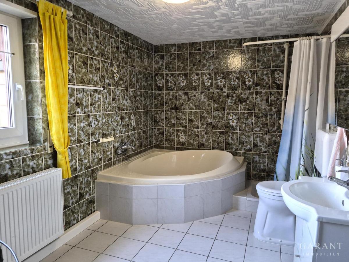 Im Haus befinden sich zwei Bäder, die beide renovierungsbedürftig sind. Im Obergeschoss gibt es zusätzlich eine Sauna. Das Obergeschoss ist bereits ausgebaut und wird aktuell über eine Elektroheizung beheizt. Die neue Zentralheizung versorgt momentan das Erdgeschoss. Mit überschaubarem Aufwand könnten die Heizleitungen auch nach oben erweitert werden. Das Warmwasser wird derzeit elektrisch erzeugt.