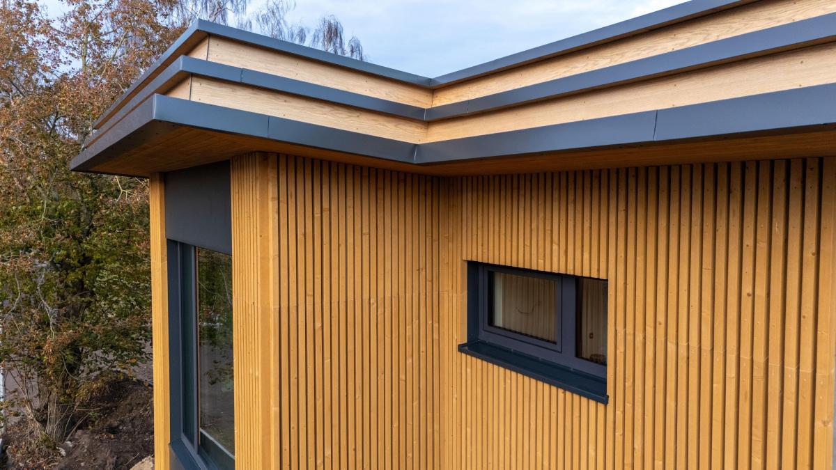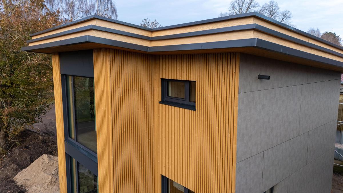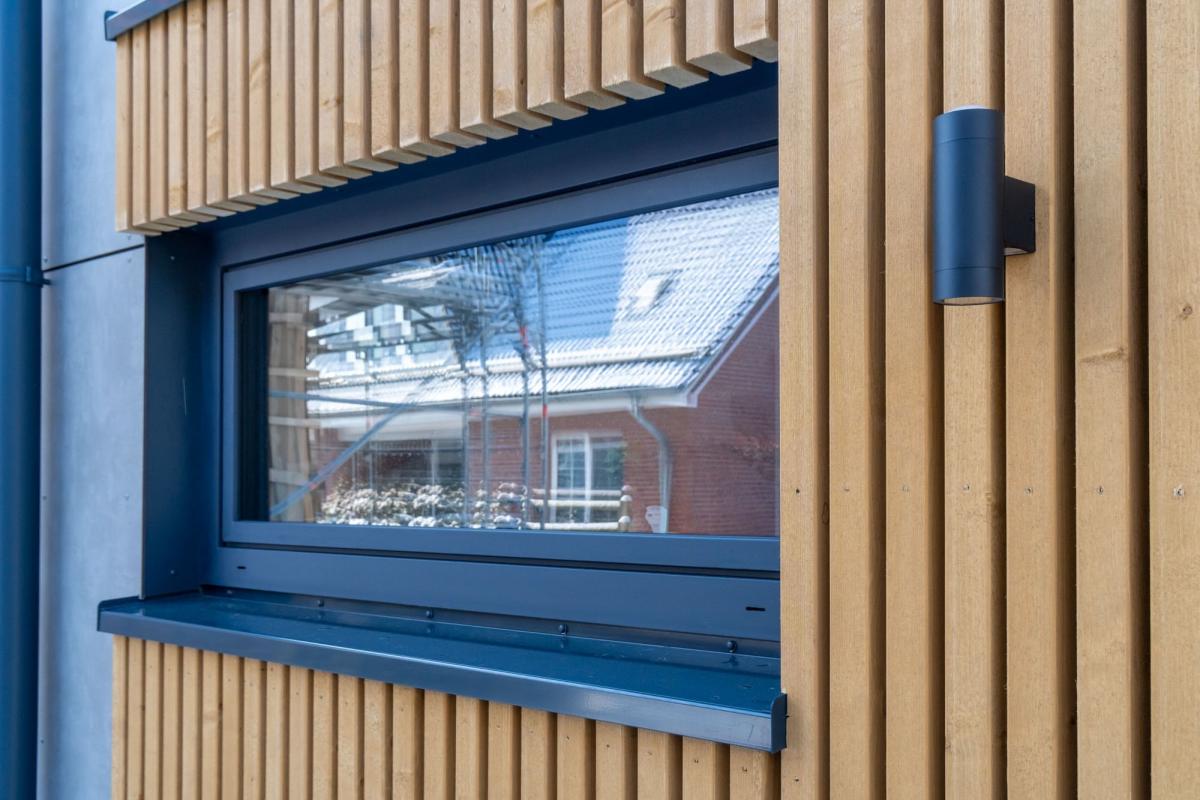 • Hochwertige Holzfassade kombiniert mit Betonoptik