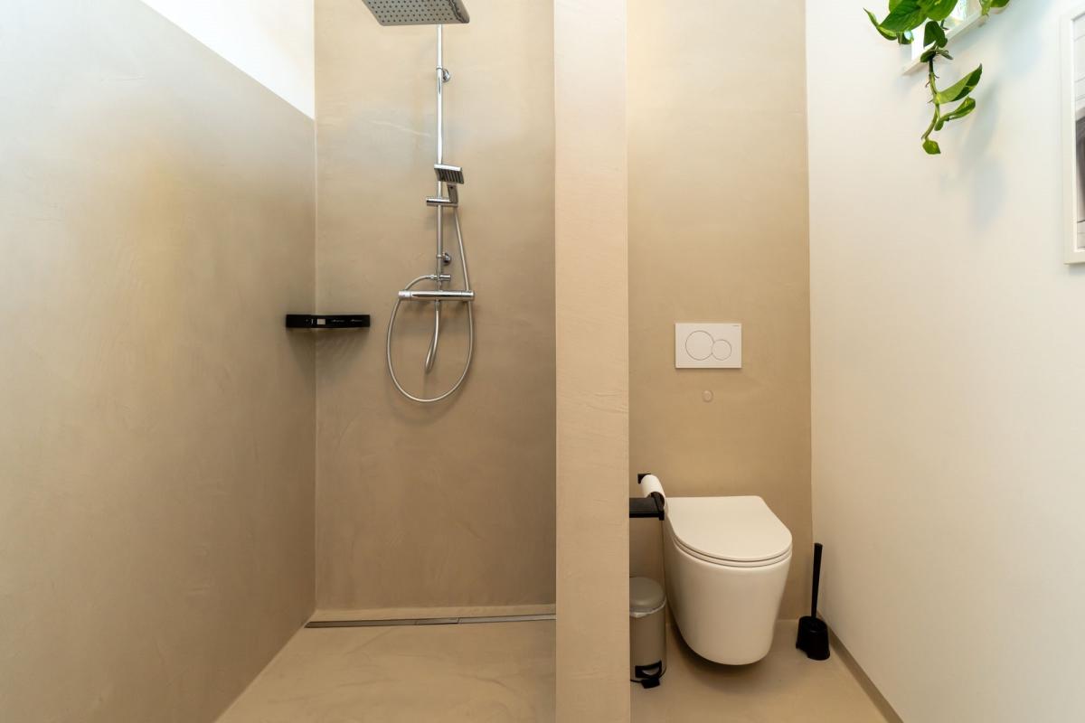 • Fugenlose Beton Flow Beläge in Bad WC und auf der Treppe